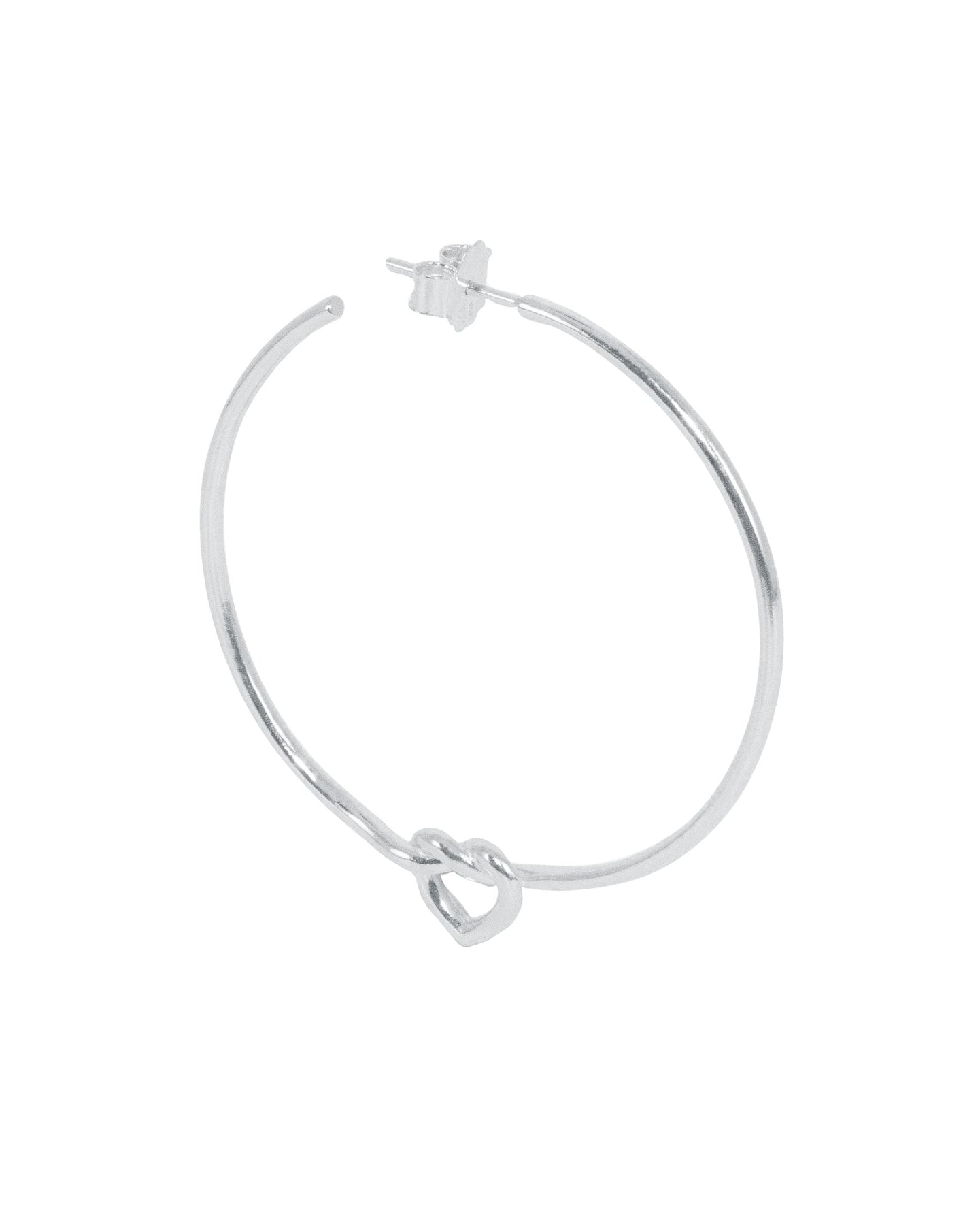 Ohrring von Jane Kønig, gefertigt aus Sterlingsilber mit einem großen gebundenen Herz-Design. Das Herz sitzt an einem runden Creolenring und dient als dekoratives Element.