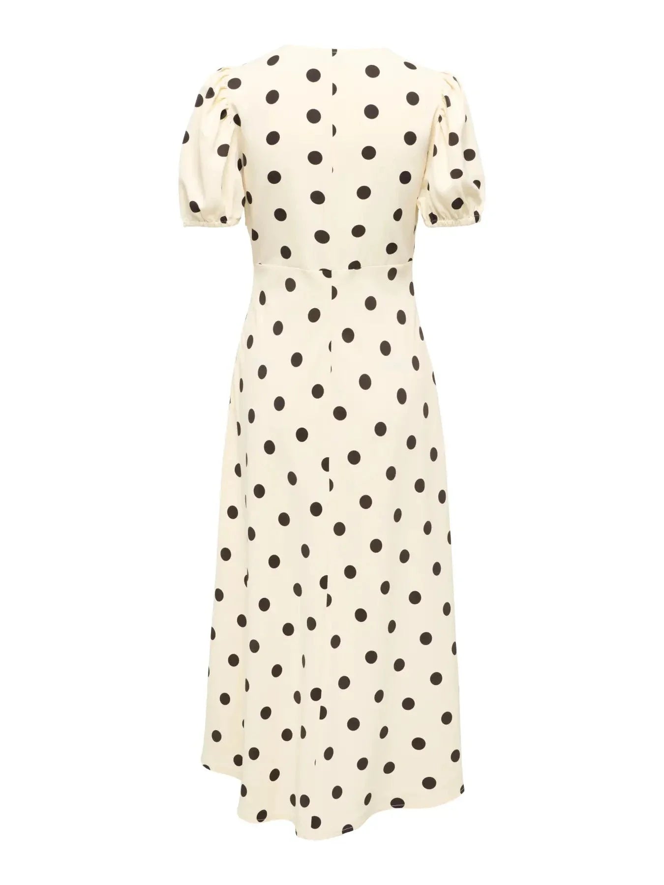 Midikleid von JDY in einem hellen Cremefarbton mit schokoladenfarbenen Punkten. Das Kleid hat kurze Puffärmel und einen V-Ausschnitt.