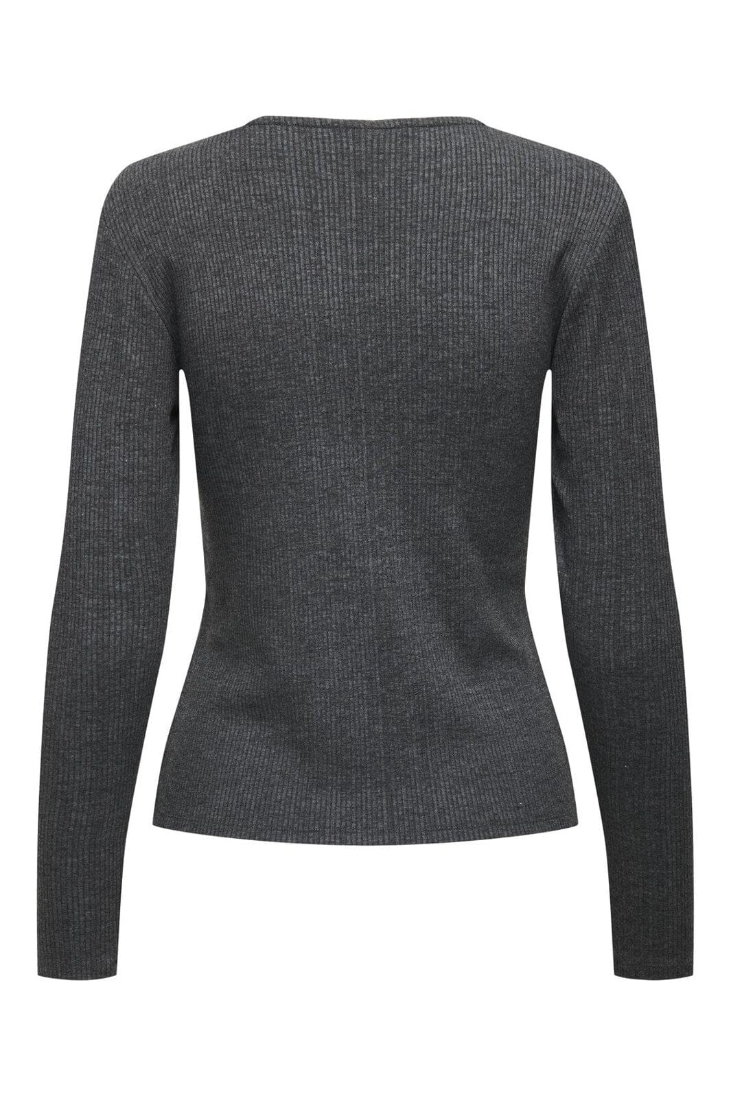 Dunkelgraues Oberteil von JDY mit langen Ärmeln und asymmetrischer Knopfleiste. Die gerippte Struktur sorgt für eine gute Passform, während der graumelierte Farbton leicht zu stylen ist.