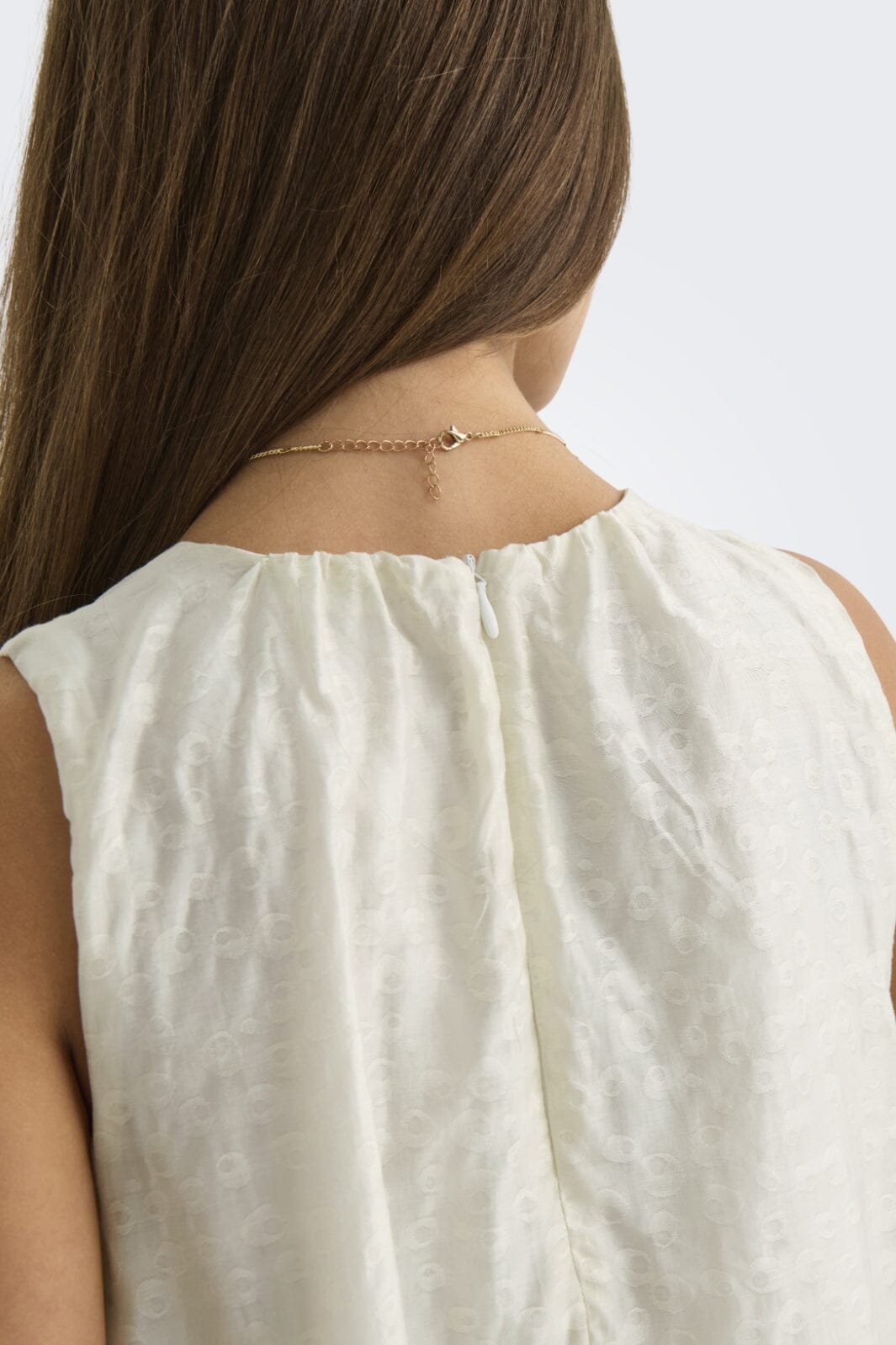 Ärmelloses Kleid von JDY aus birkenfarbigem Stoff mit Rundhalsausschnitt. Das Kleid hat eine reguläre Passform und ein charakteristisches Bubble-Hem-Design mit Reißverschluss auf der Rückseite.