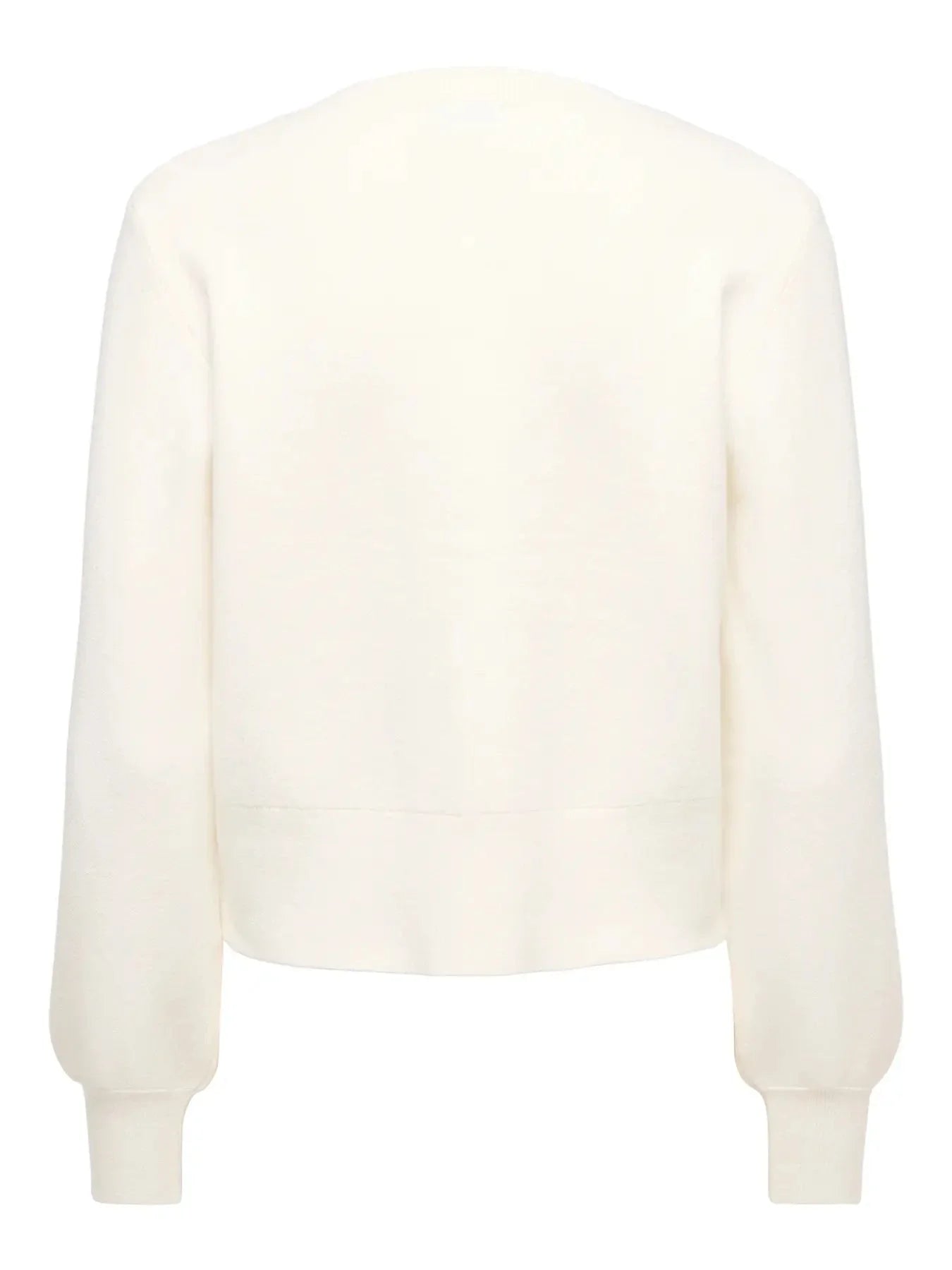 Gestrickte Strickjacke von JDY in der Farbe Cloud Dancer, einem cremeweißen Farbton. Die Strickjacke besteht aus 50 % recyceltem Polyester, 28 % Polyester und 22 % Viskose.