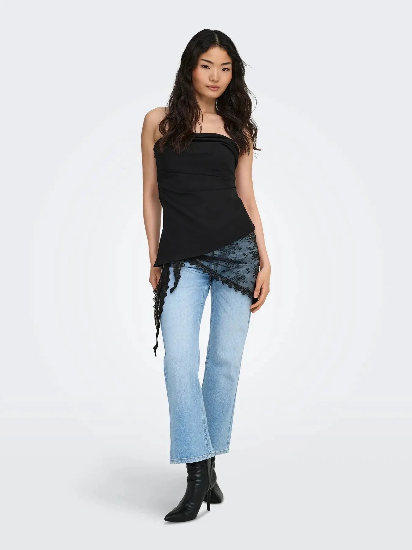 Schwarzes Spitzenschal von JDY mit einem Blumenmuster. Der Schal hat einen gewellten Rand entlang der gesamten Kante und ein bindbares Design mit geknoteten Enden.