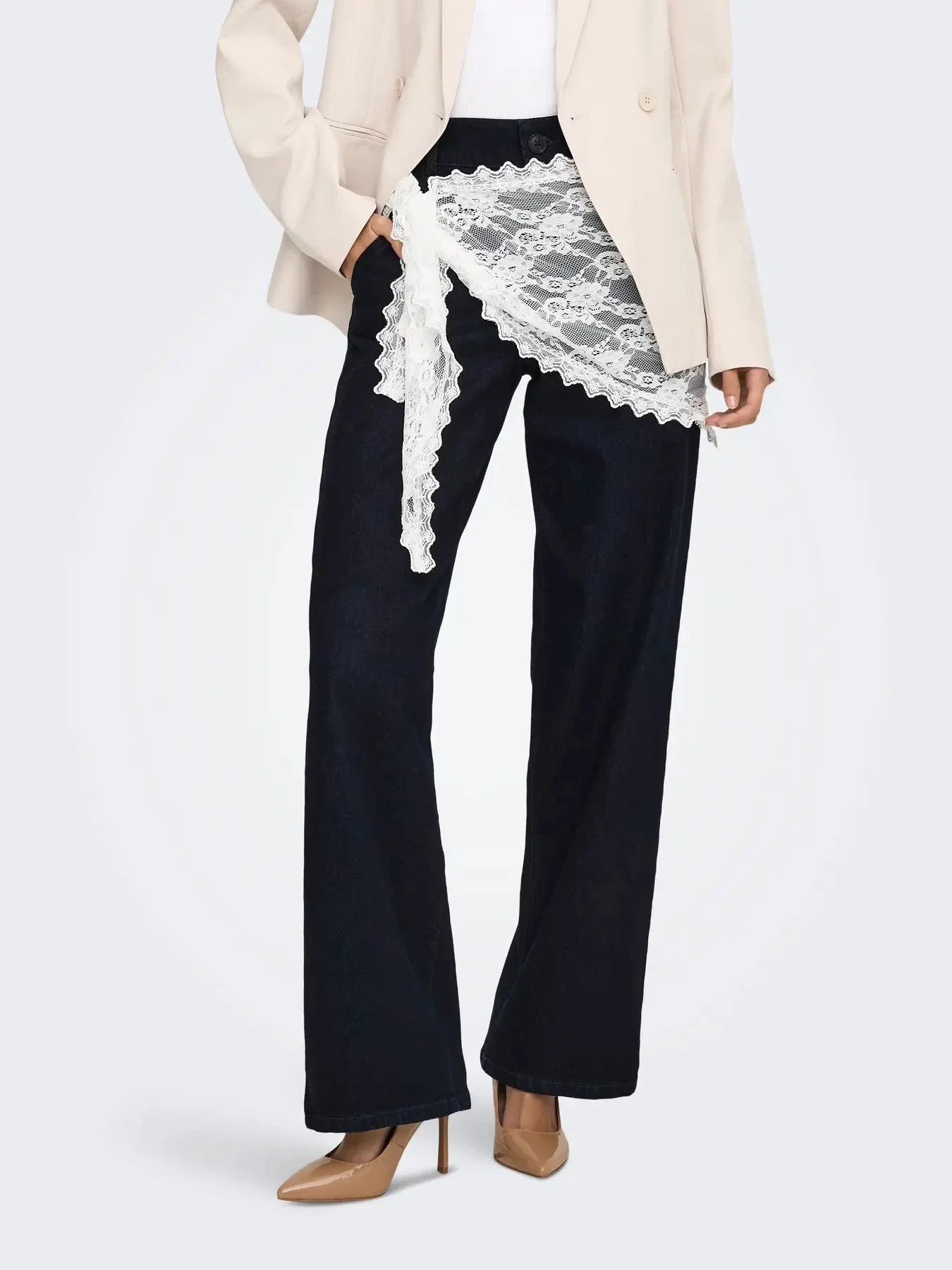 Ein weißes Spitzenhalstuch von JDY in dreieckiger Form mit gewellten Kanten. Die Spitze hat ein Blumenmuster, und die Farbe ist off-white.