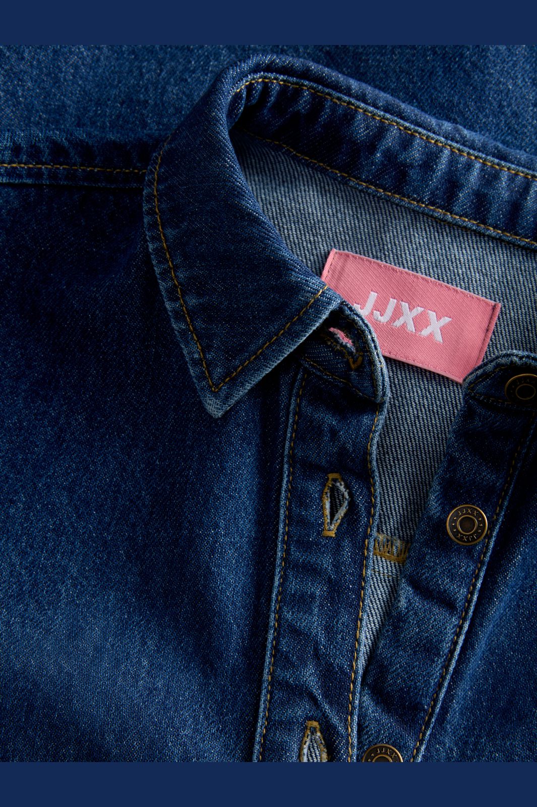 Kurzes Denimkleid von Jjxx aus mittelblauem Denim. Das Kleid hat eine lockere Passform, kurze Ärmel und einen Hemdkragen mit Knopfverschluss.