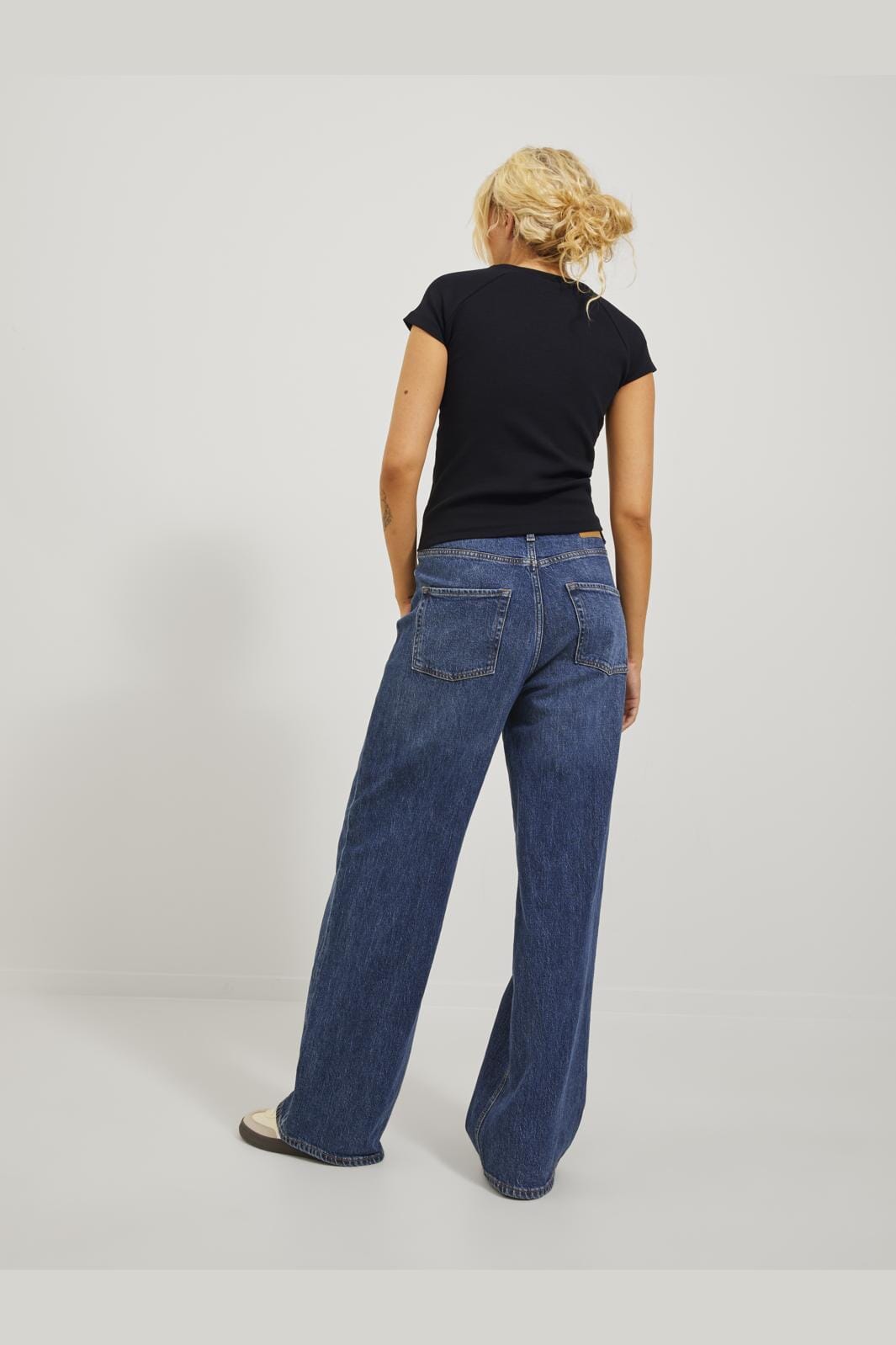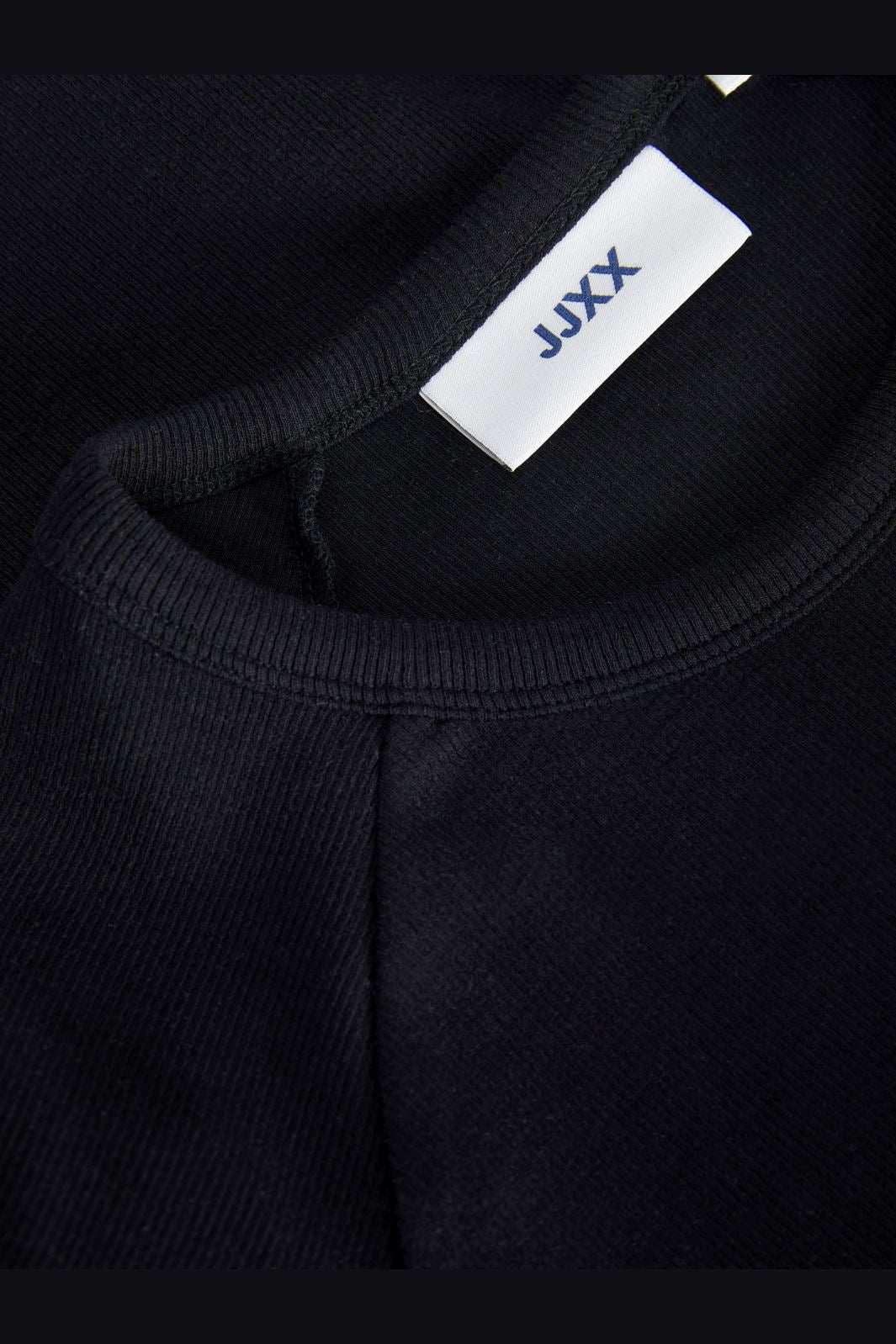Schwarzes T-Shirt von Jjxx aus Rippstrick mit Stretch-Passform. Das T-Shirt hat einen runden Halsausschnitt und kurze Ärmel. Die enganliegende Passform folgt den Körperlinien und bietet gute Bewegungsfreiheit.