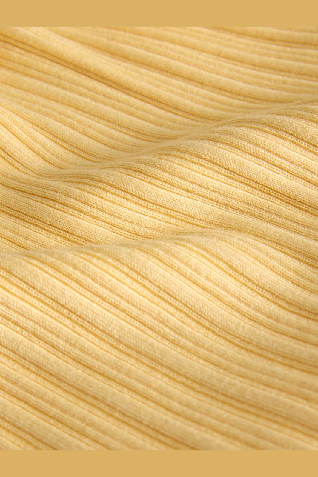 Ein gelber Polo-Strickpullover von Jjxx mit Rippstrick und vertikalen Rillen. Das Poloshirt hat eine figurbetonte Passform und kurze Ärmel.