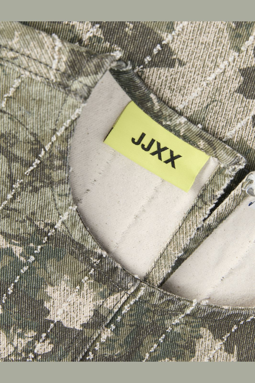 Ärmlose Top von JJXX in Grün mit einem camouflageähnlichen Muster in grünen und beigen Nuancen. Das Top hat einen Rundhalsausschnitt und eine Regular-Fit-Passform.