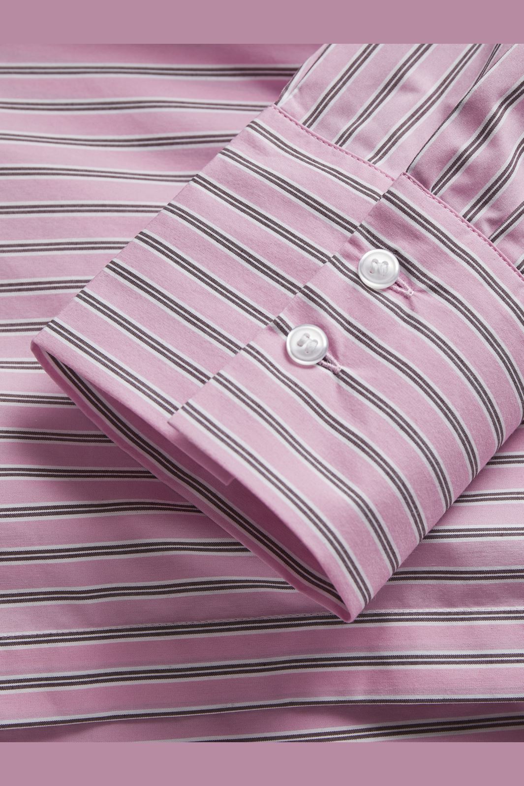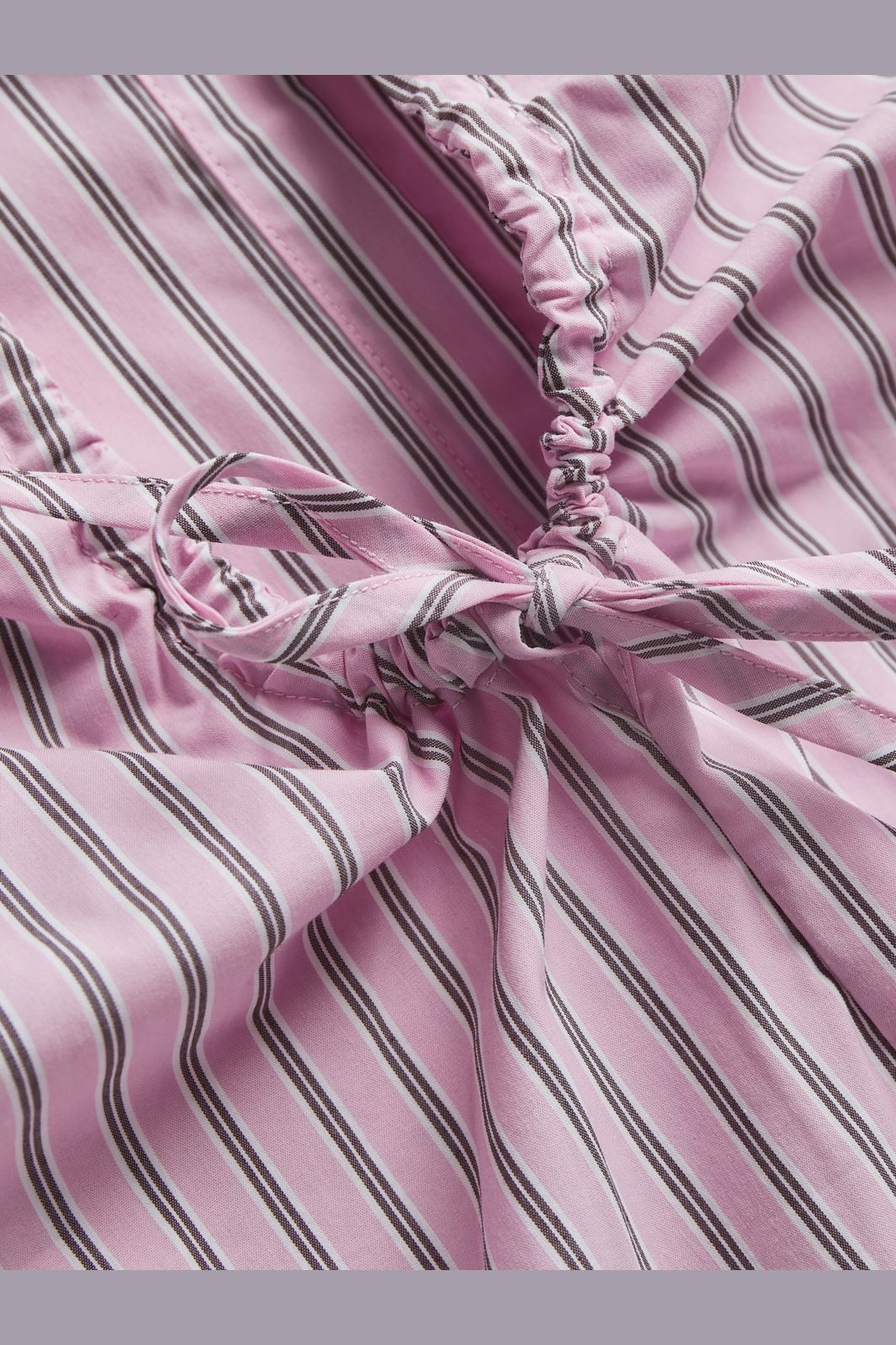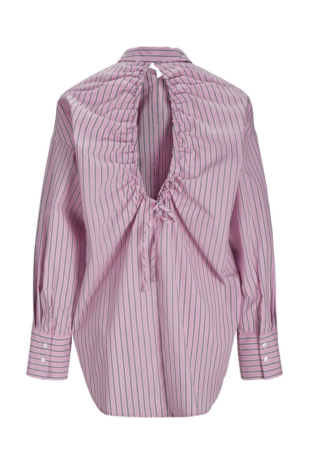 Gestreifte Bluse von Jjxx in Pink und Weiß. Sie hat eine Oversize-Passform mit Hemdkragen und langen Ärmeln. Die Bluse kommt mit einem Bindeband und Knöpfen an den Manschetten.