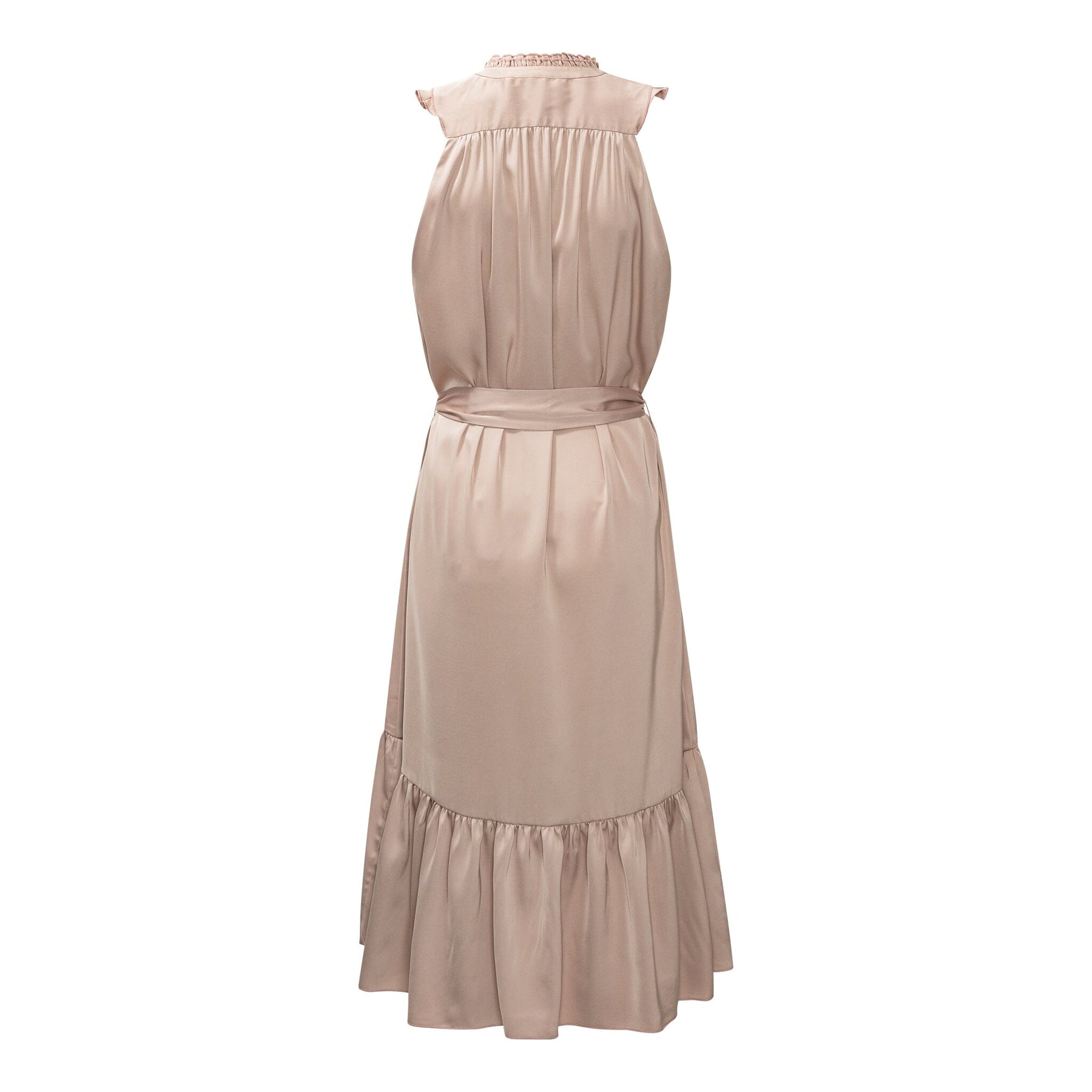 Rosa Kleid von Karmamia mit ärmellosem Design und hohem Halsausschnitt. Das Kleid hat dekorative Knöpfe vorne und einen Bindegürtel in der Taille.