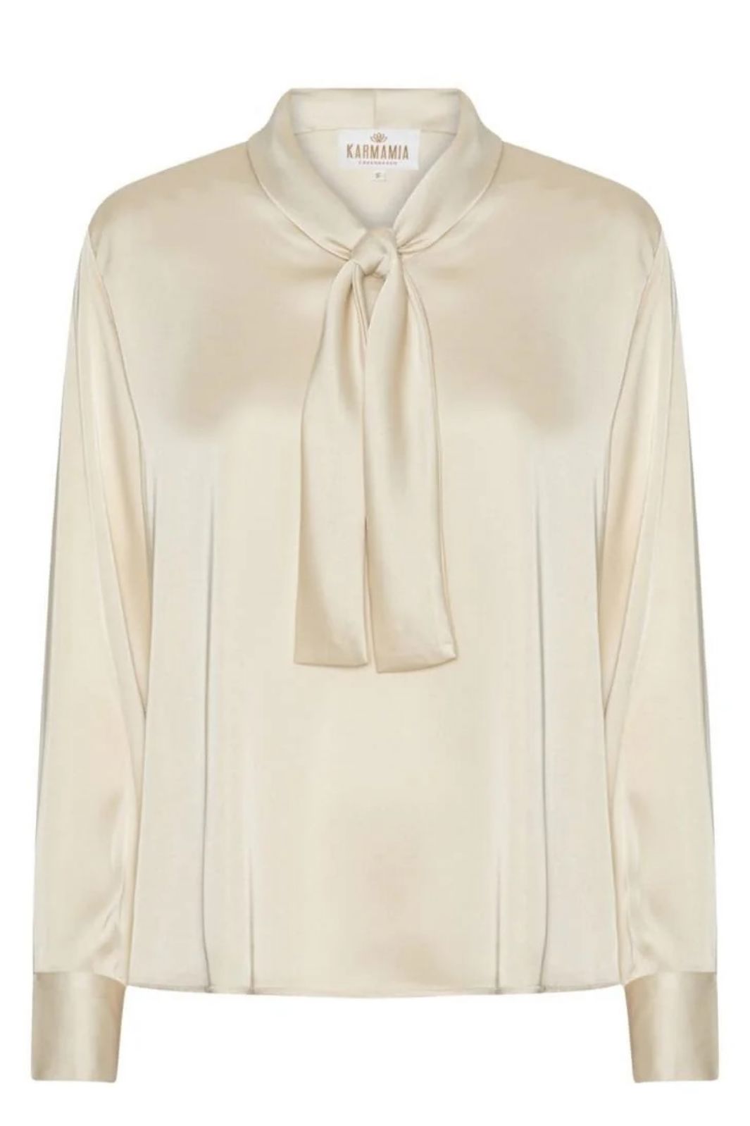 Cremfarbene Bluse von Karmamia mit glänzender Oberfläche und Bindeband am Hals. Die glänzende Oberfläche kommt von einer Mischung aus Triacetat und recyceltem Polyester.