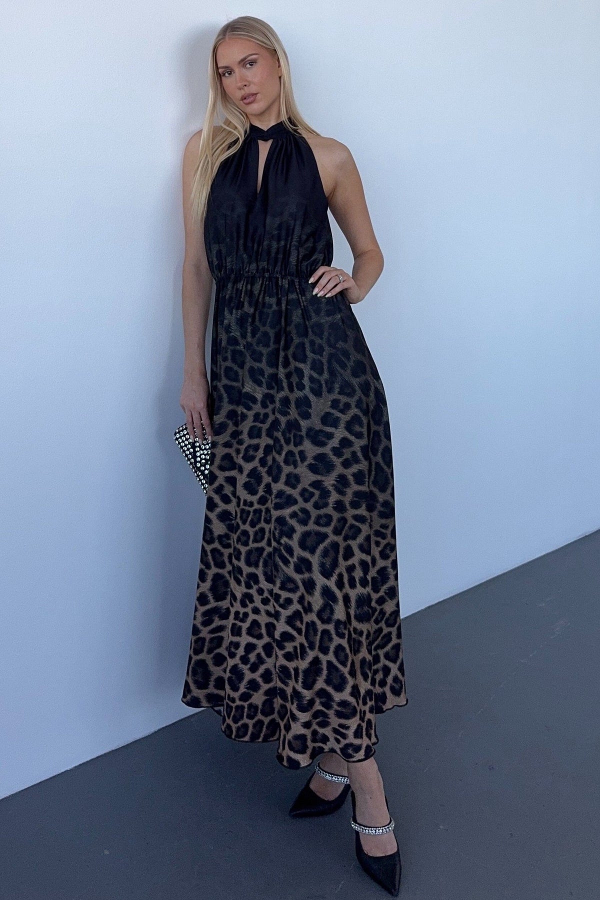 Bodenlanges Kleid von Karmamia im schwarz-beigen Verlauf-Leopardenmuster. Das Kleid hat einen V-Ausschnitt kombiniert mit einem Halterneck und einer elastischen Taille, die gute Bewegungsfreiheit bietet.