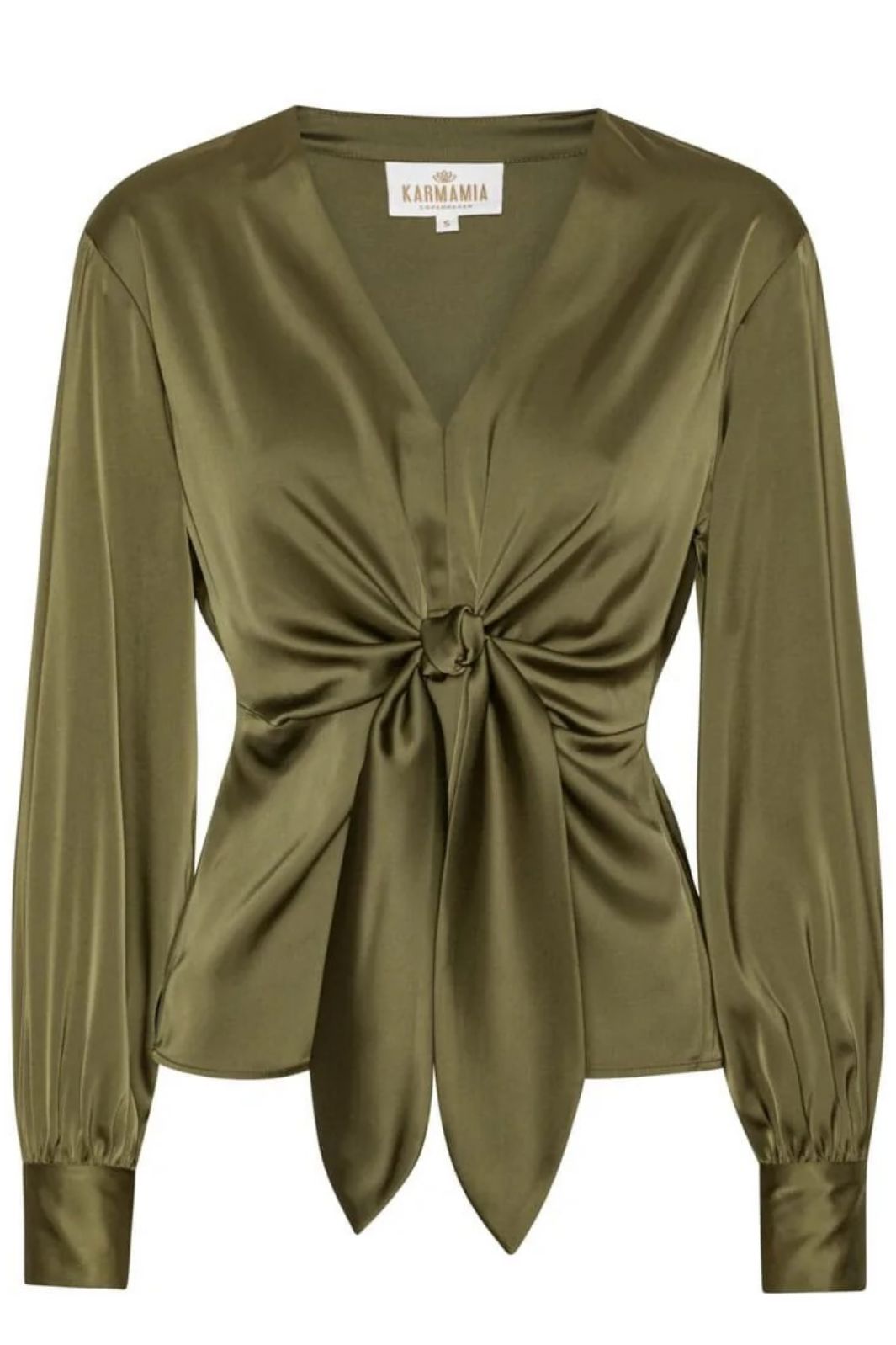 Olivgrüne Bluse von Karmamia mit V-Ausschnitt und Knotendetail vorne. Die Bluse hat lange Ärmel mit Puffeffekt an den Handgelenken und besteht aus einem glänzenden, glatten Stoff.