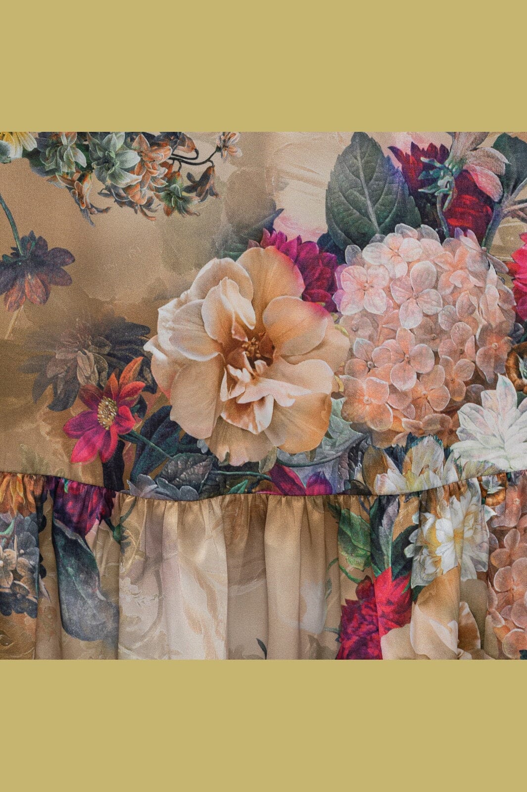 Langer Rock von Karmamia mit Blumenprint auf goldenem Hintergrund. Der Rock hat Rüschen-Details am Saum und ein mehrlagiges Design.