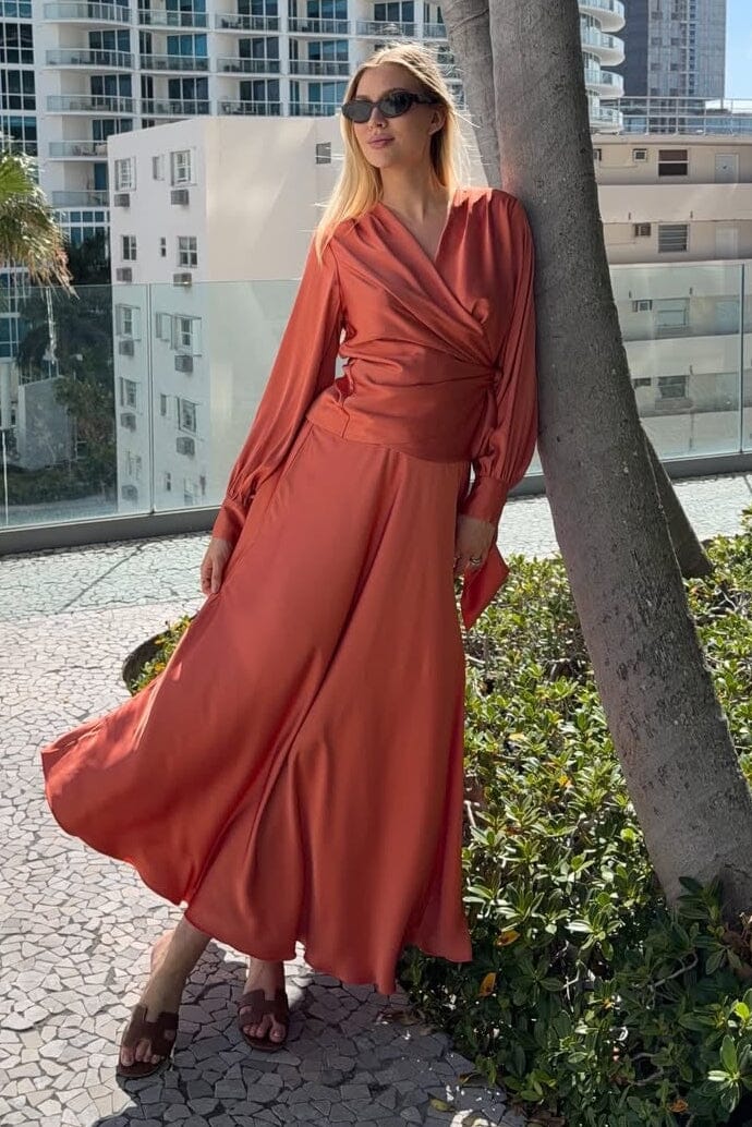 Wickelbluse von Karmamia in einem orangefarbenen Ton. Die Bluse hat einen V-Ausschnitt und ein Knotendetail an der Seite.