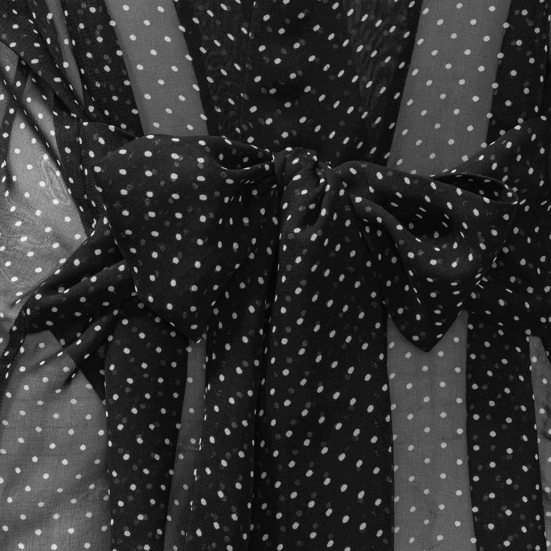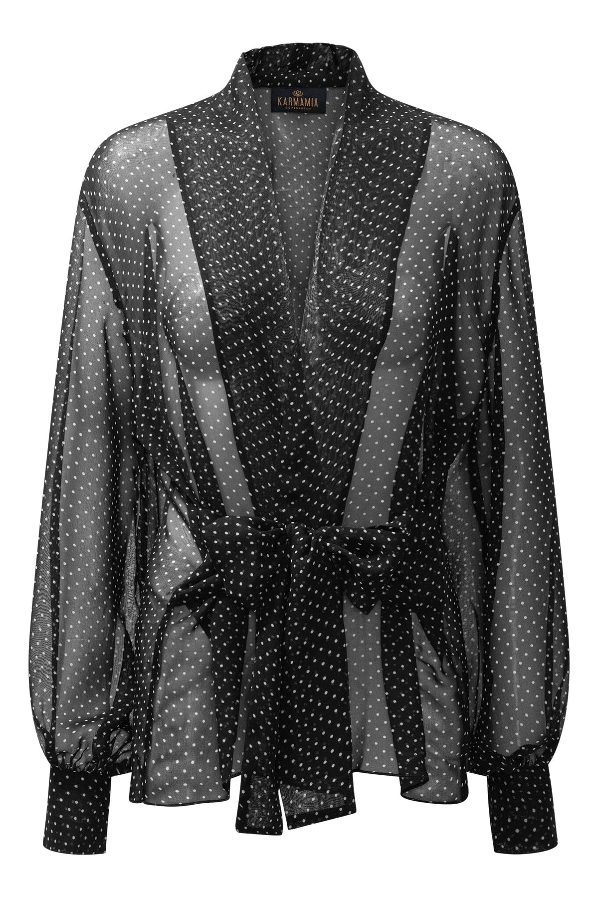 Schwarze Wickelbluse von Karmamia mit weißen Punkten. Die Bluse besteht aus transparentem Mesh-Material aus 100 % Polyester und hat ein Bindeband zum Schließen.