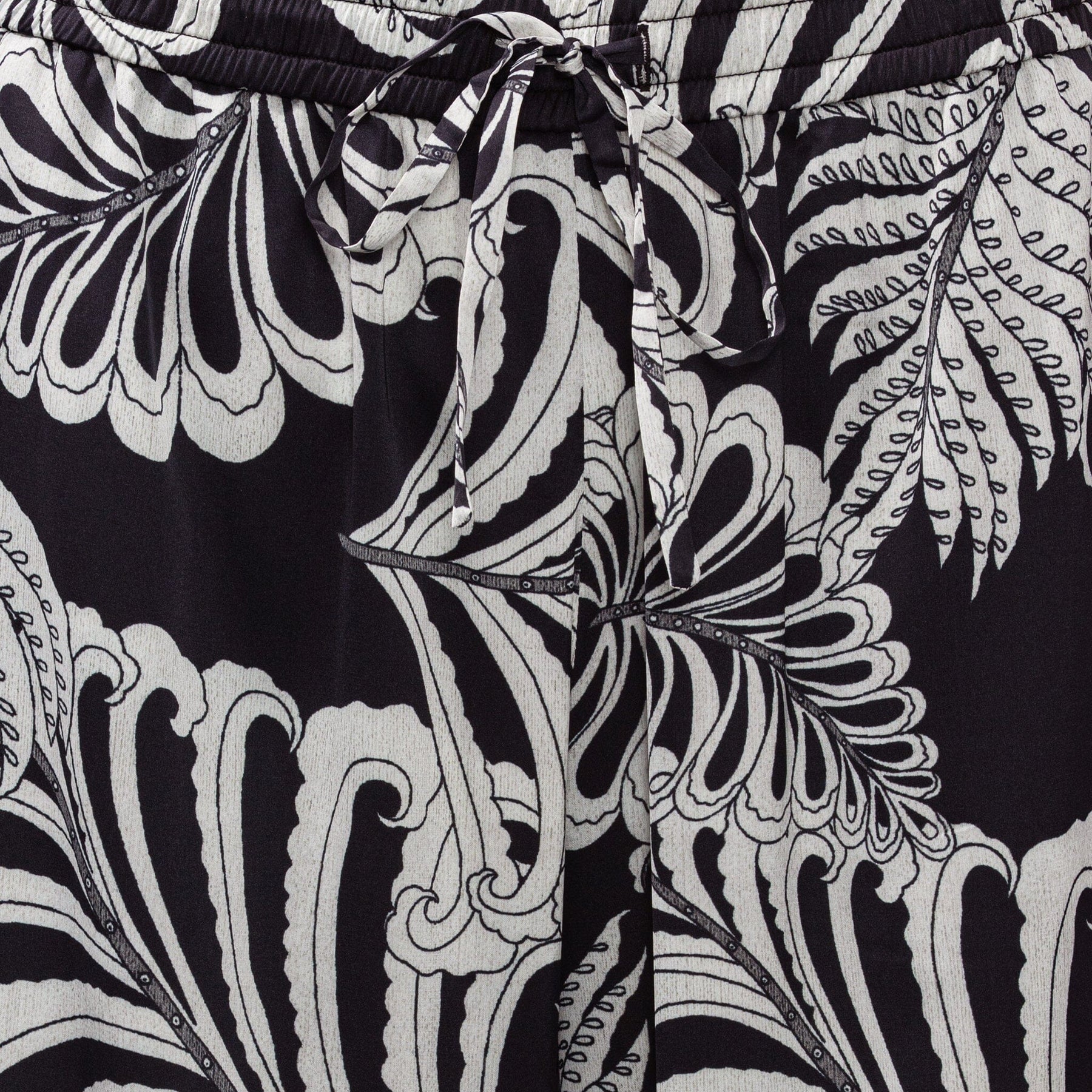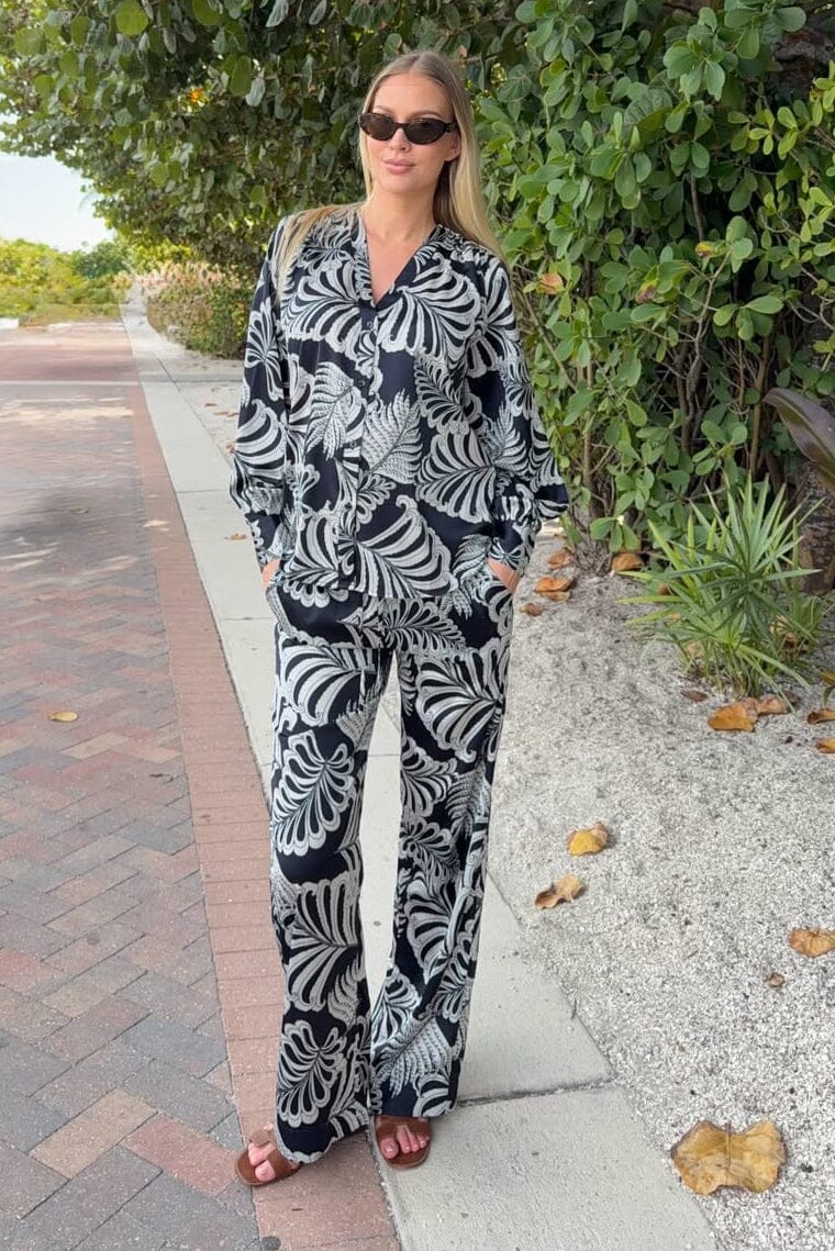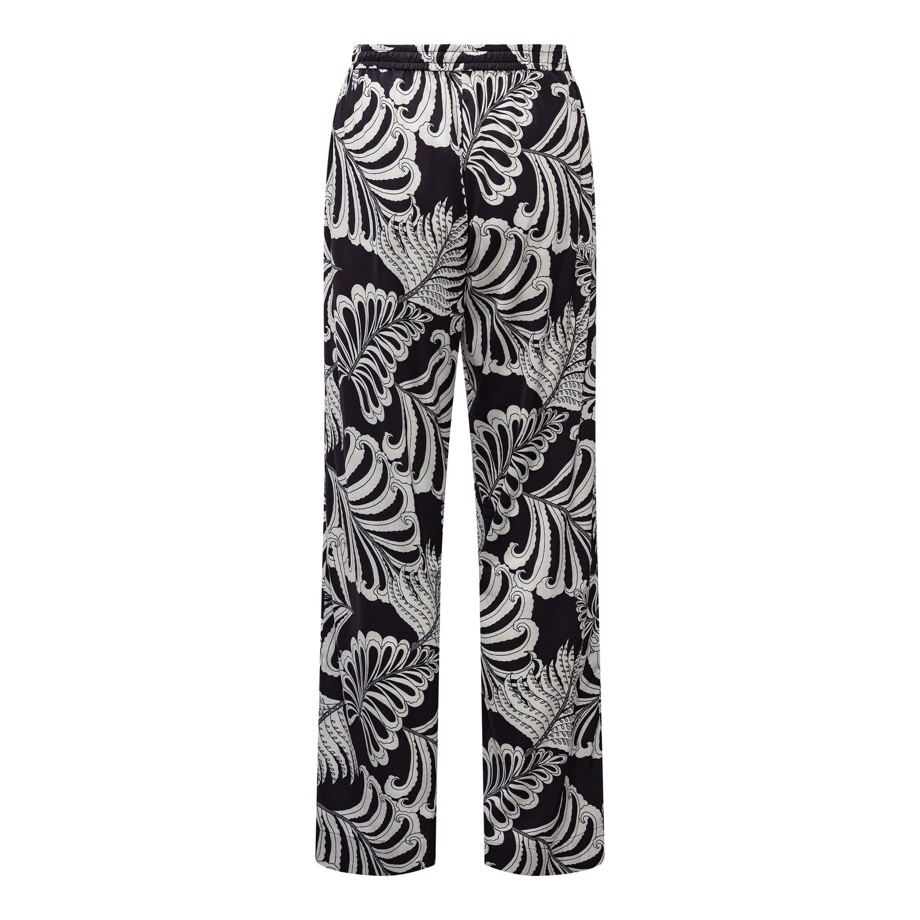 Hose von Karmamia mit einem dunkelblauen und weißen Palmenblattmuster. Die Hose hat gerade Beine und einen Bindegürtel in der Taille.