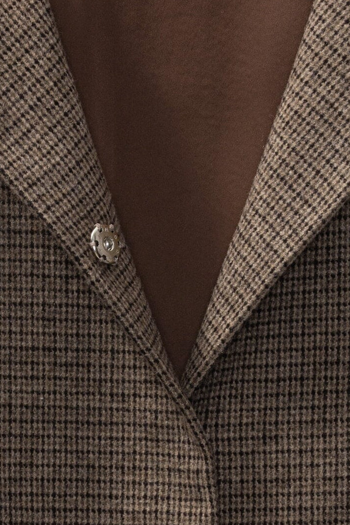Kariertes Jackett von Karmamia in brauner Nuance. Das Jackett hat Peplum-Ärmel mit gestuften Rüschen und zwei sichtbare Metallknöpfe am Halsausschnitt.