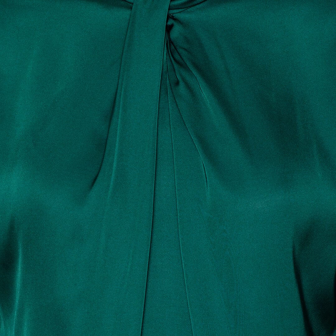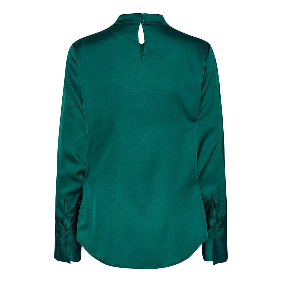 Dunkelgrüne Bluse von Karmamia mit hohem Kragen und Bindedetail. Die glänzende satinierte Oberfläche verleiht einen klaren Ausdruck, und die Bluse hat lange Ärmel sowie eine Knopfverschluss auf der Rückseite.