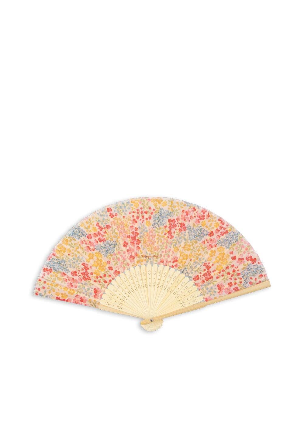 Handfächer von Konges Sløjd mit mehrfarbigem Blumenmuster. Der Fächer hat rosa, gelbe und blaue Blumen sowie Herzen, Kirschen und Leopardenmuster.