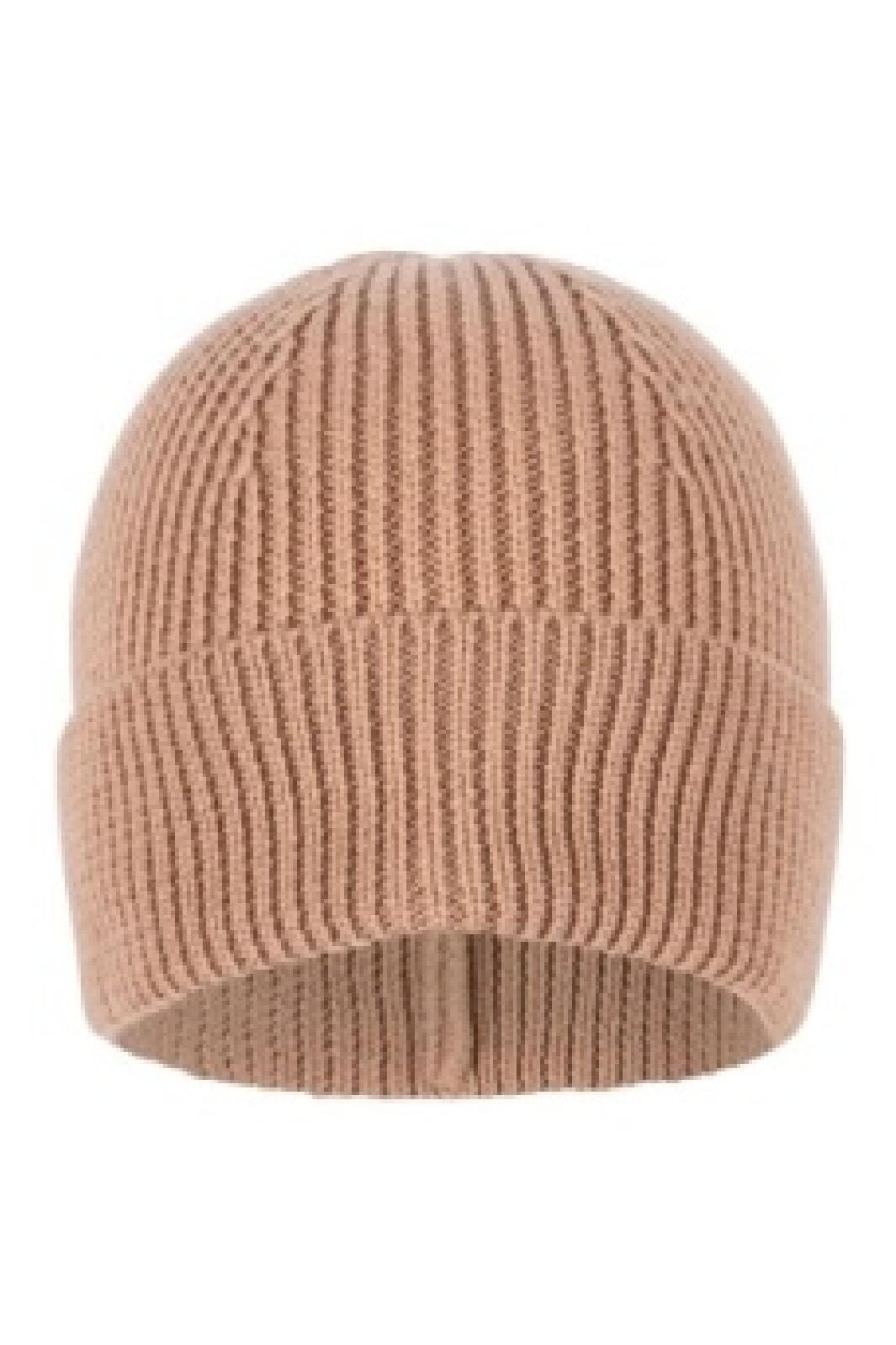Strickmütze von Konges Sløjd in einem hellbraunen Farbton. Die Mütze hat eine gerippte Struktur und einen umgeschlagenen Rand, der eine gute Passform bietet.