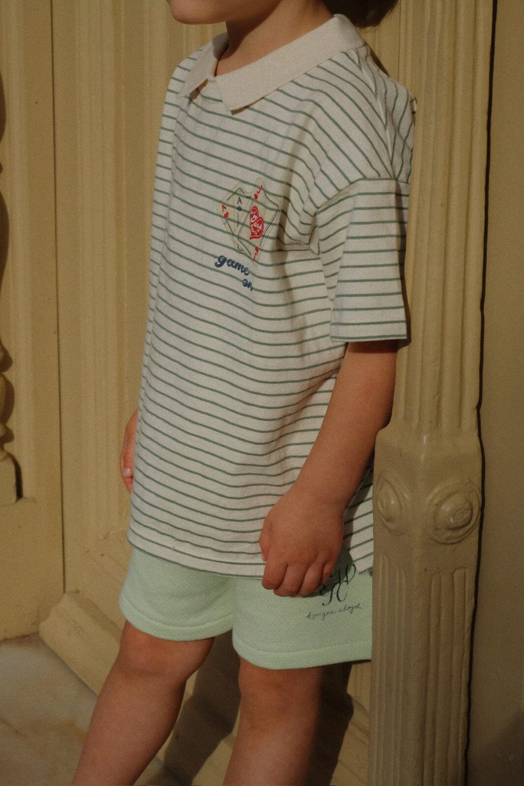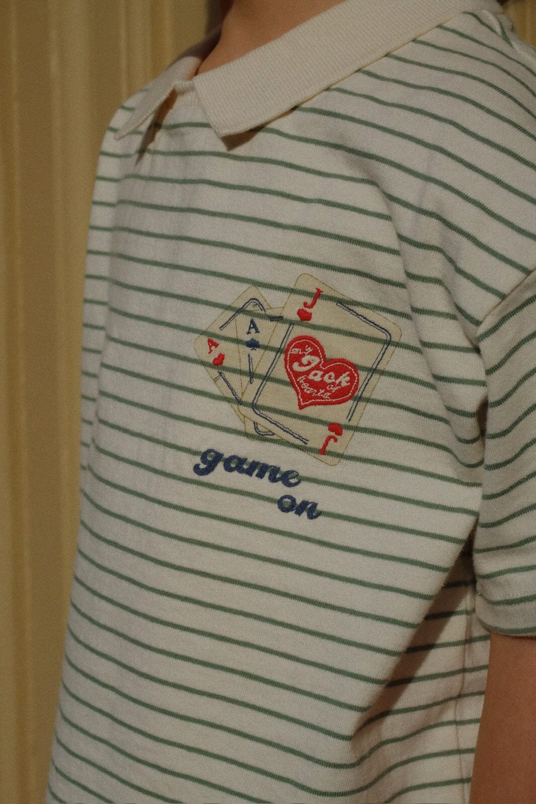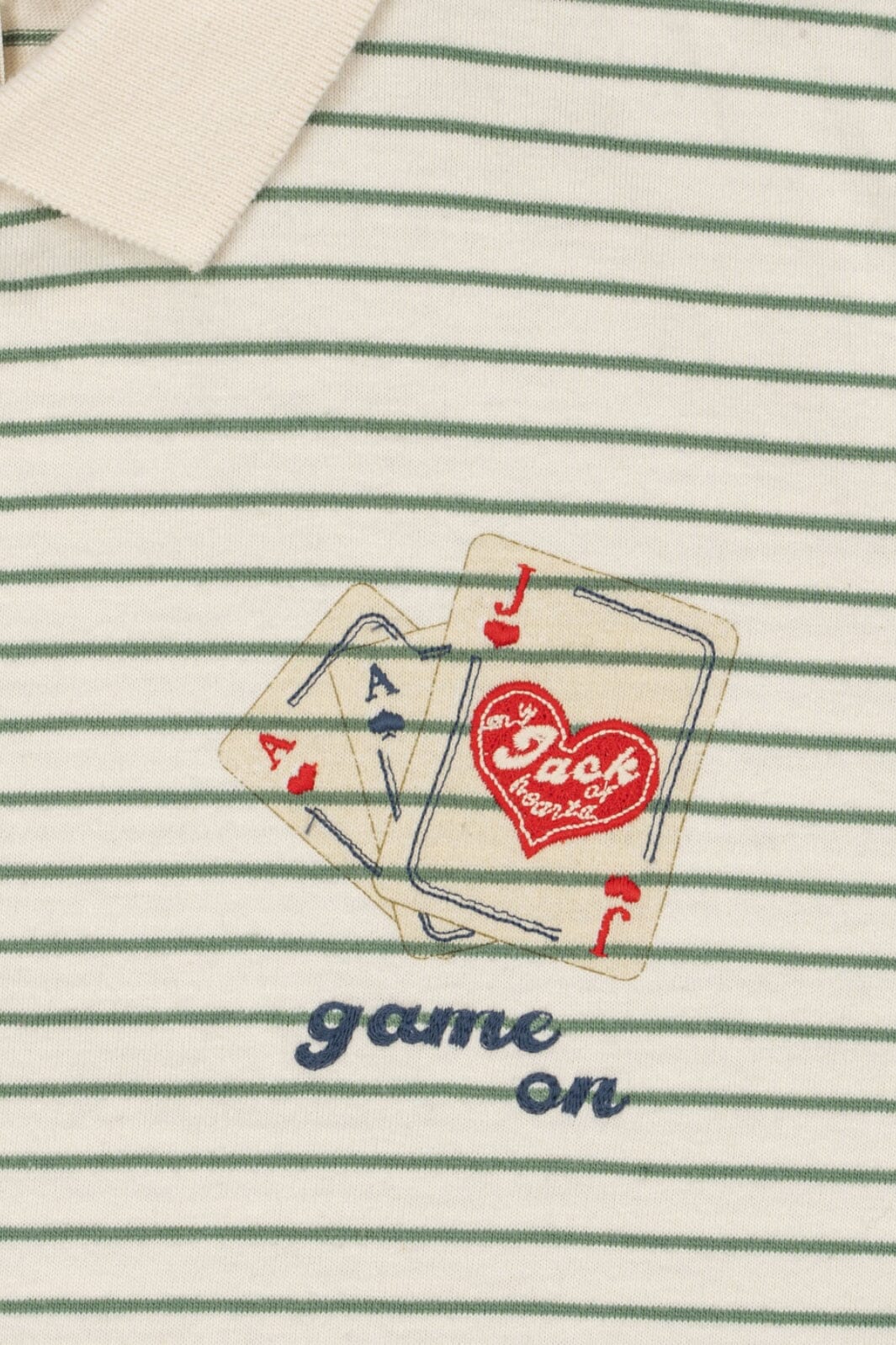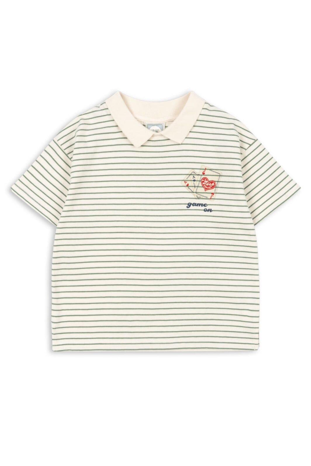 Gestreifte Polo-T-Shirt von Konges Sløjd mit grünen Streifen auf hellem Grund. Das gestickte Spielkartenmotiv und der Text game on auf der Vorderseite verleihen der T-Shirt einen verspielten Ausdruck.