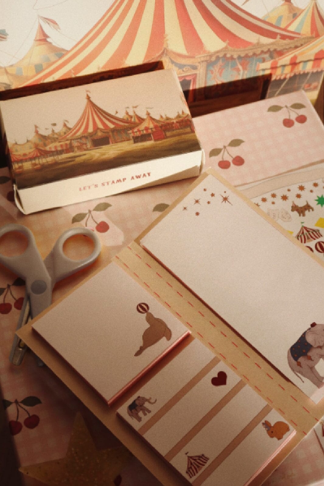 Das Set enthält verschiedene kreative Materialien wie Stempel, Aufkleber und Karten. Alles ist mit einem durchgängigen Zirkusthema in roten und weißen Nuancen gestaltet.