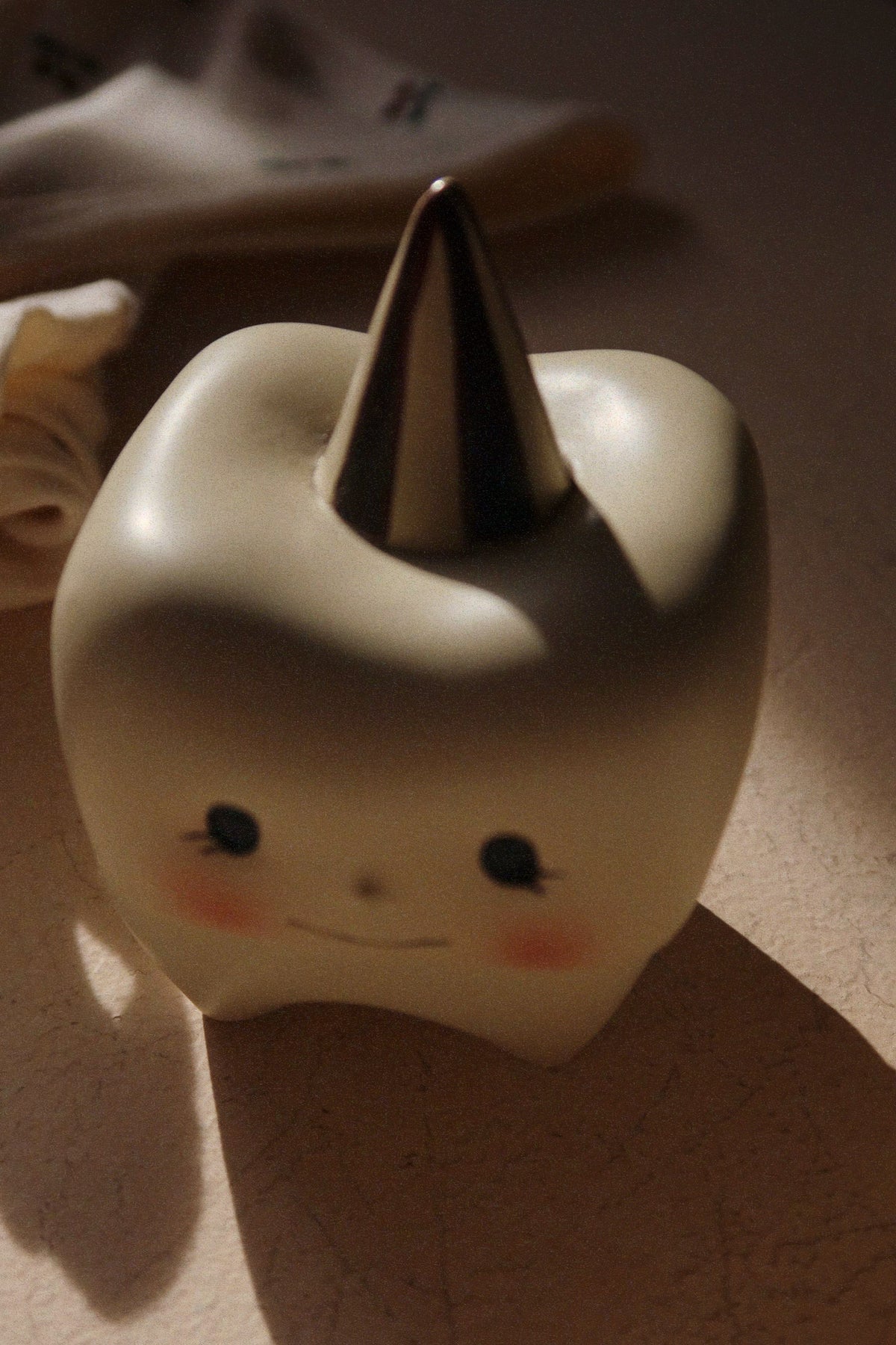 Eine zahnförmige Aufbewahrungsbox von Konges Sløjd mit dekorativen Details. Die Box ist wie ein Zahn geformt und hat ein Gesicht auf der Vorderseite.