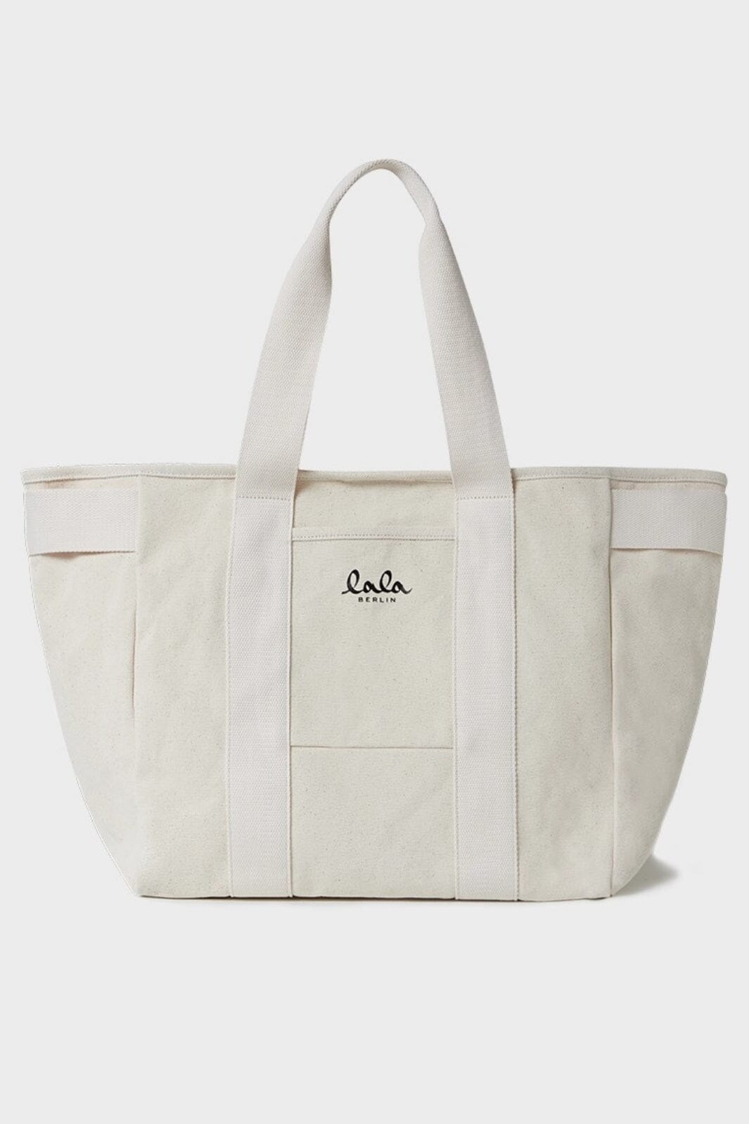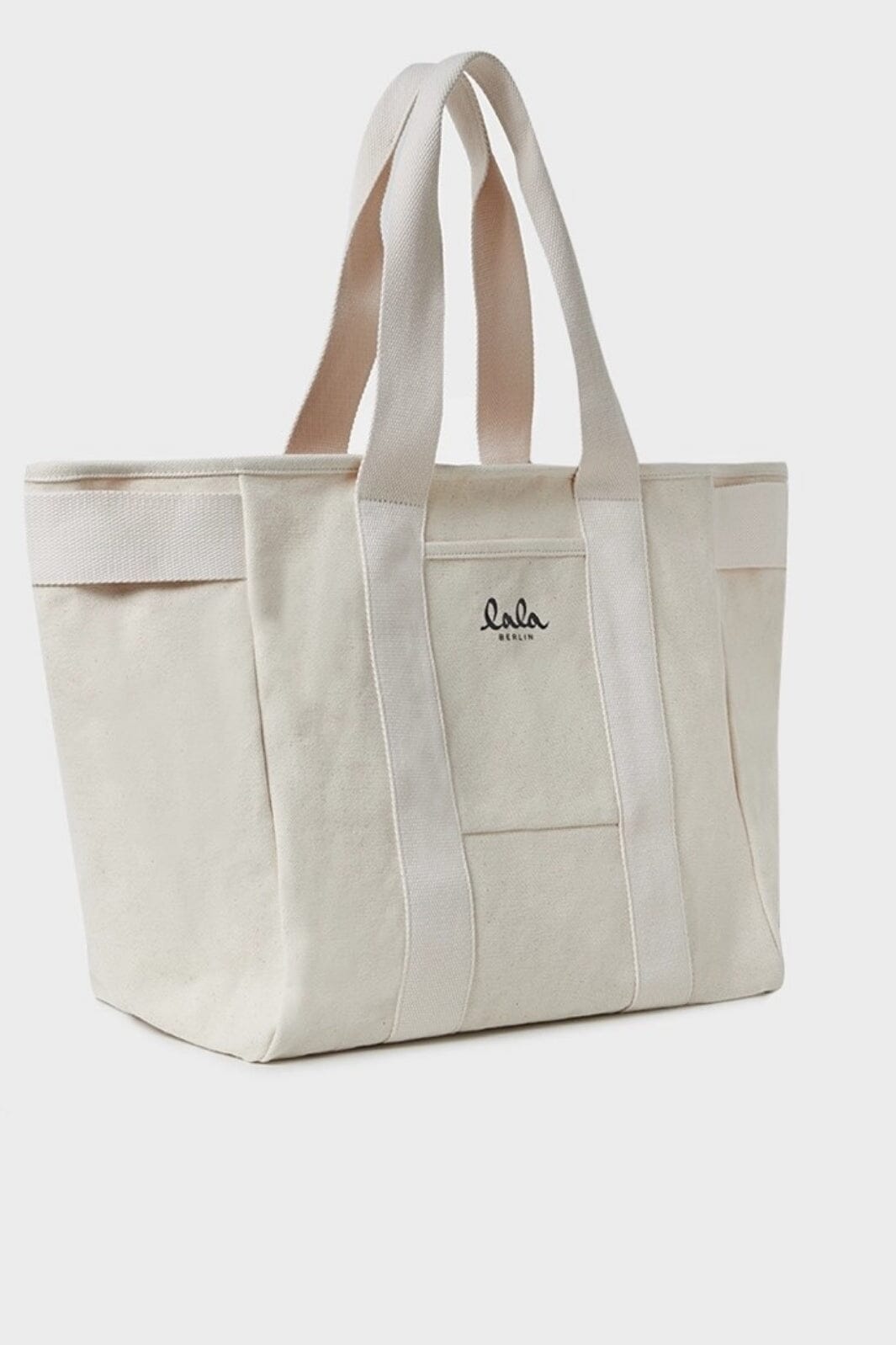 Beige Tote-Tasche von Lala Berlin aus Canvas-Material. Die Tasche hat ein dezentes Logo auf der Vorderseite und robuste Griffe, die sie praktisch für den täglichen Gebrauch machen.