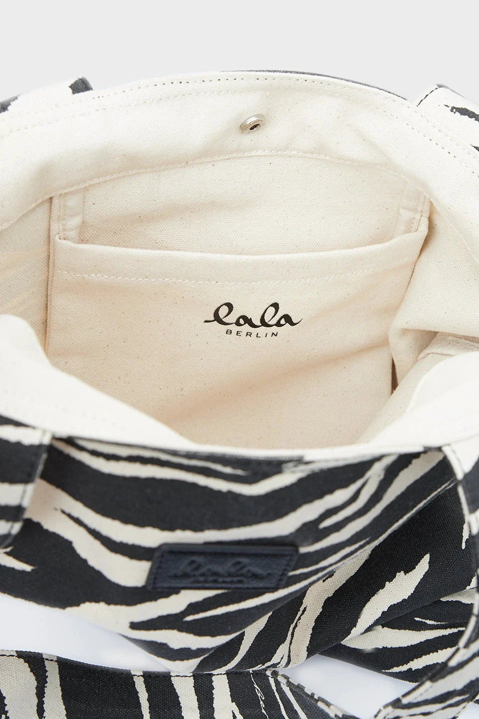 Eine Tote-Bag von Lala Berlin mit einem schwarz-weißen Tigerstreifenmuster auf bedrucktem Canvas. Die Tasche hat zwei Henkel im gleichen Muster.