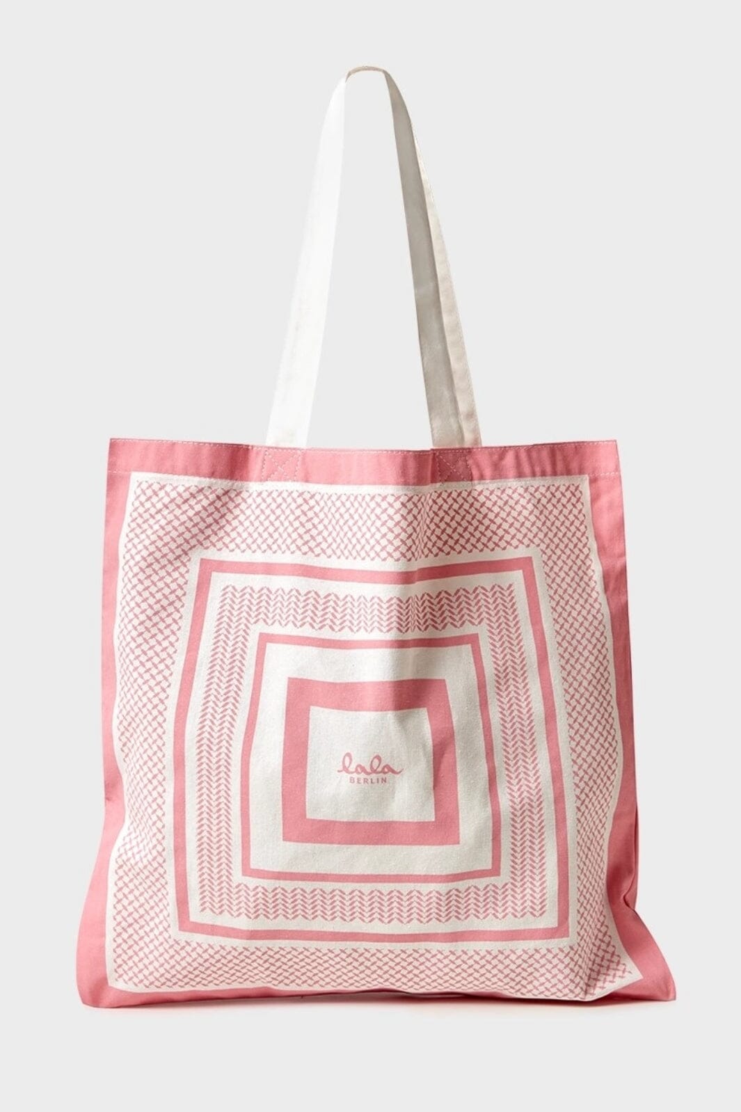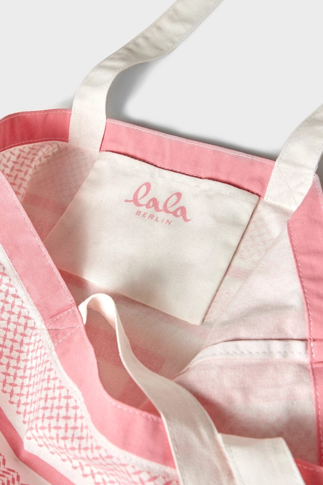 Canvas-Tasche von Lala Berlin mit pinkem und weißem geometrischem Muster. Die Tasche hat eine geräumige Inneneinrichtung und robuste Träger für den täglichen Gebrauch.