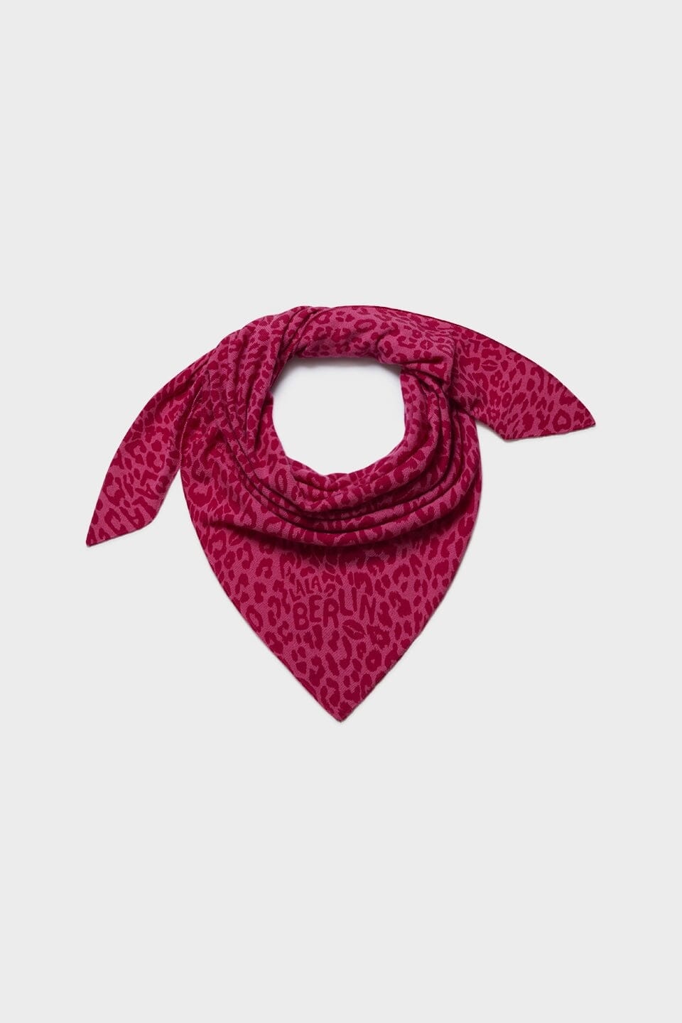 Ein dreieckiges Tuch von Lala Berlin, gefertigt aus bedrucktem Kaschmir mit einem pinkfarbenen Leopardenmuster. Das Design vereint weichen Tragekomfort mit einem mutigen Ausdruck.