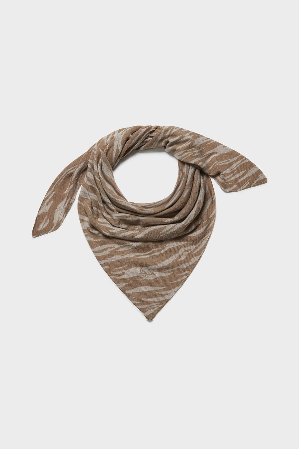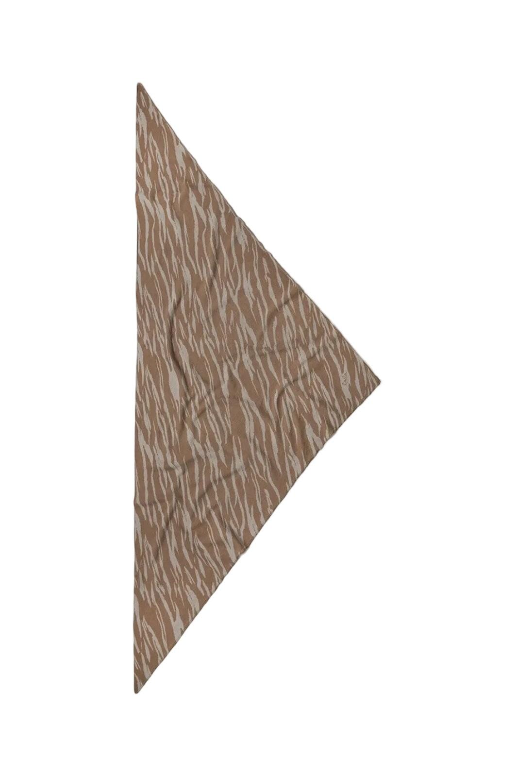 Dreieckstuch von Lala Berlin aus bedrucktem Kaschmir. Das Muster zeigt geschwungene, tigerähnliche Streifen in sandfarbener und brauner Nuance auf beigem Grund.