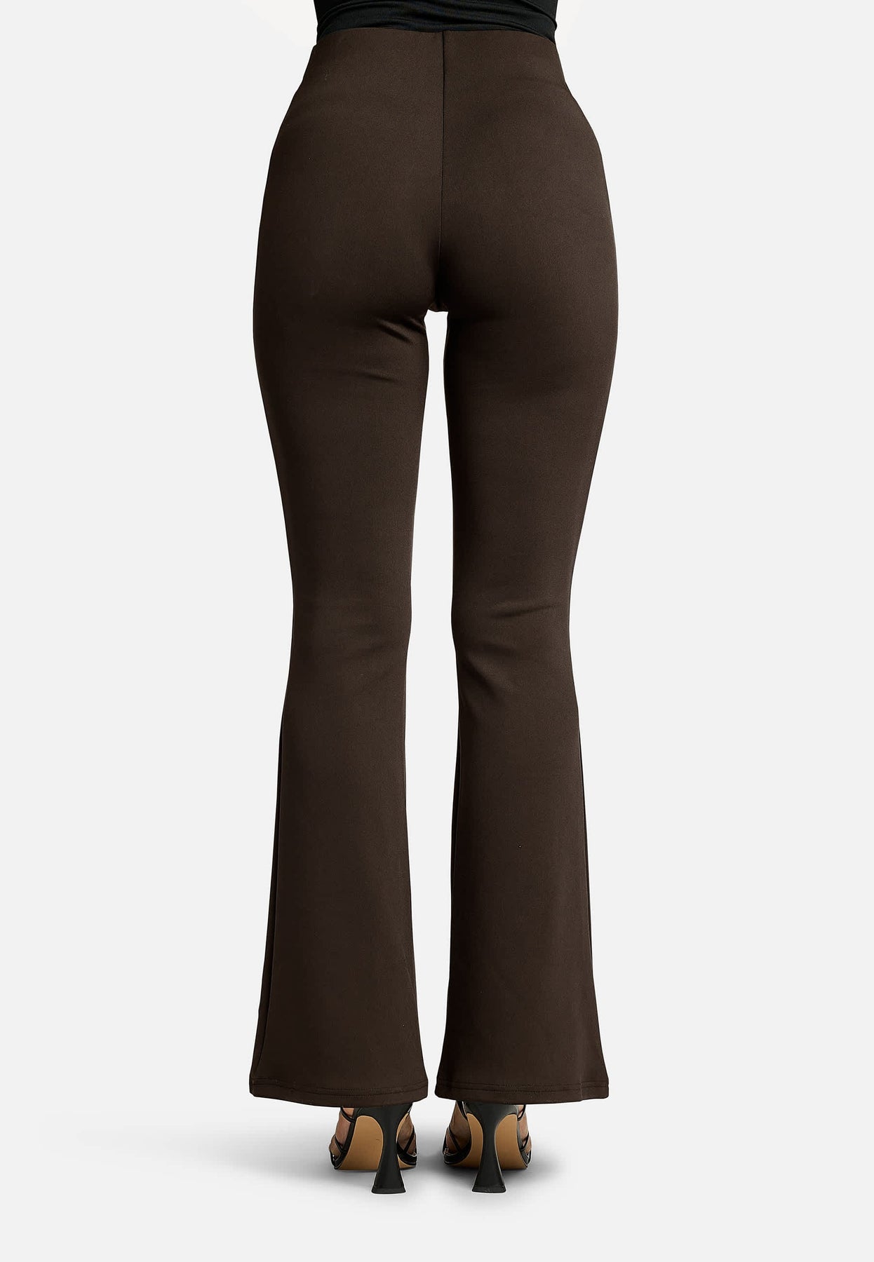 Braune Schlaghosen von Liberte, gefertigt aus einer Mischung aus Viskose, Polyester und Spandex. Die Hose hat eine warme braune Farbe und einen Schlag-Schnitt.
