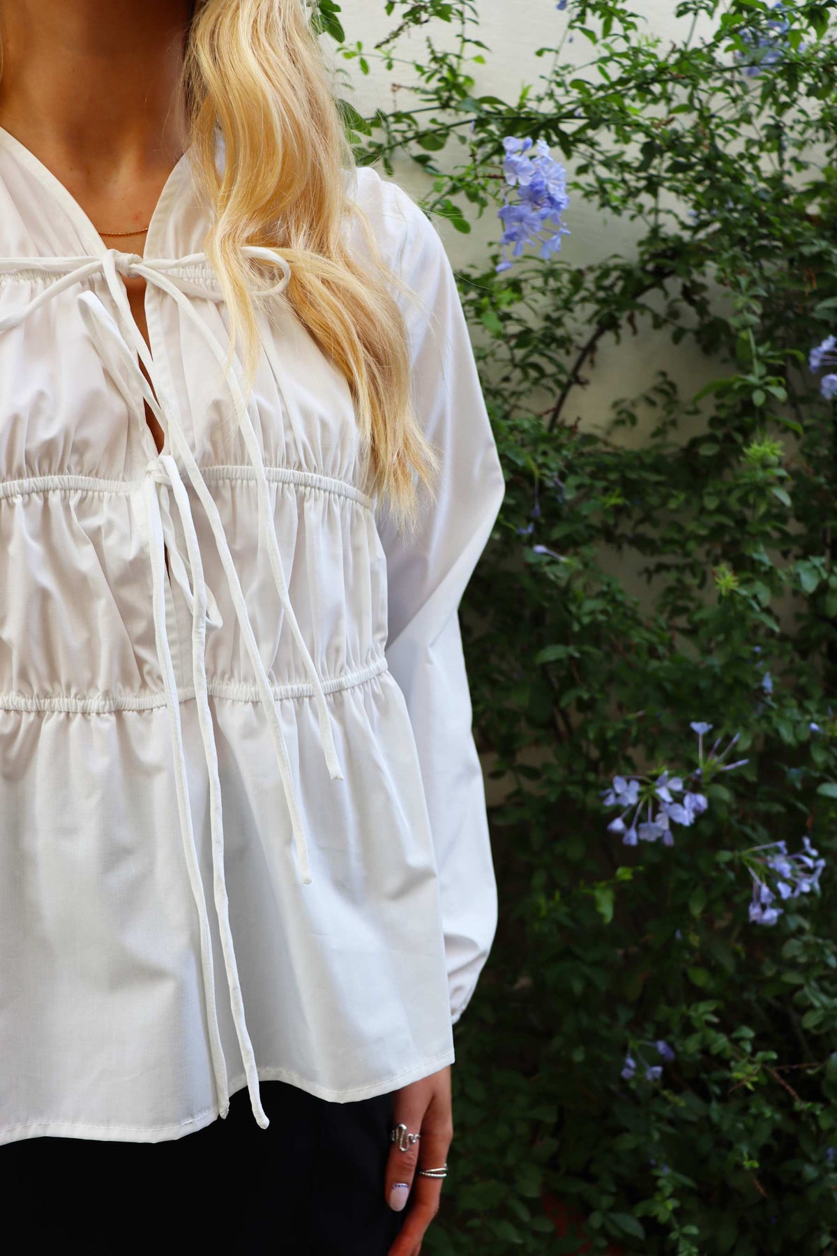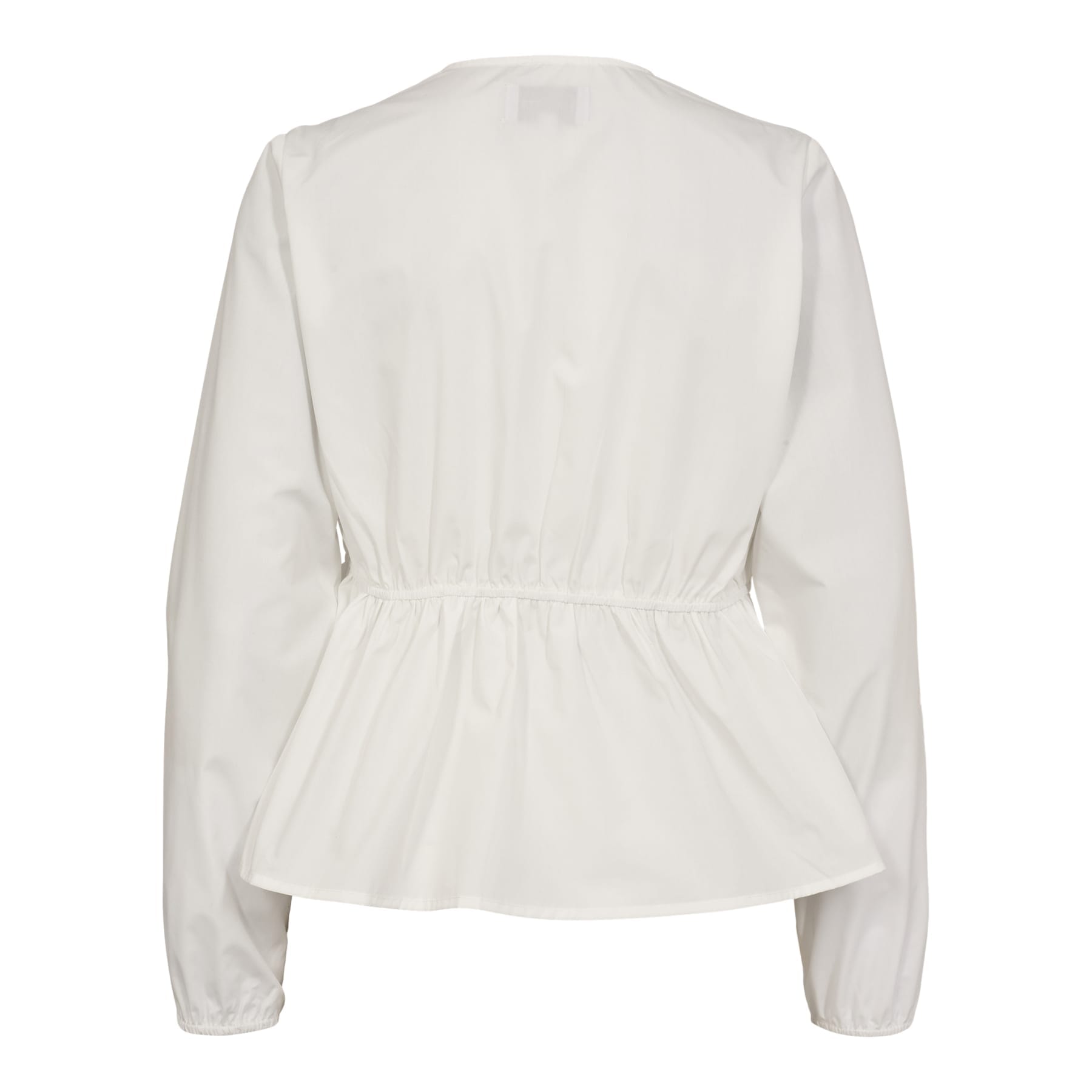 Weiße Bluse von Liberte im Peplum-Stil mit Rüschen. Die Bluse hat einen V-Ausschnitt mit Bindedetail und lange Ärmel.
