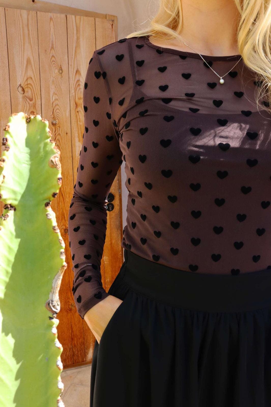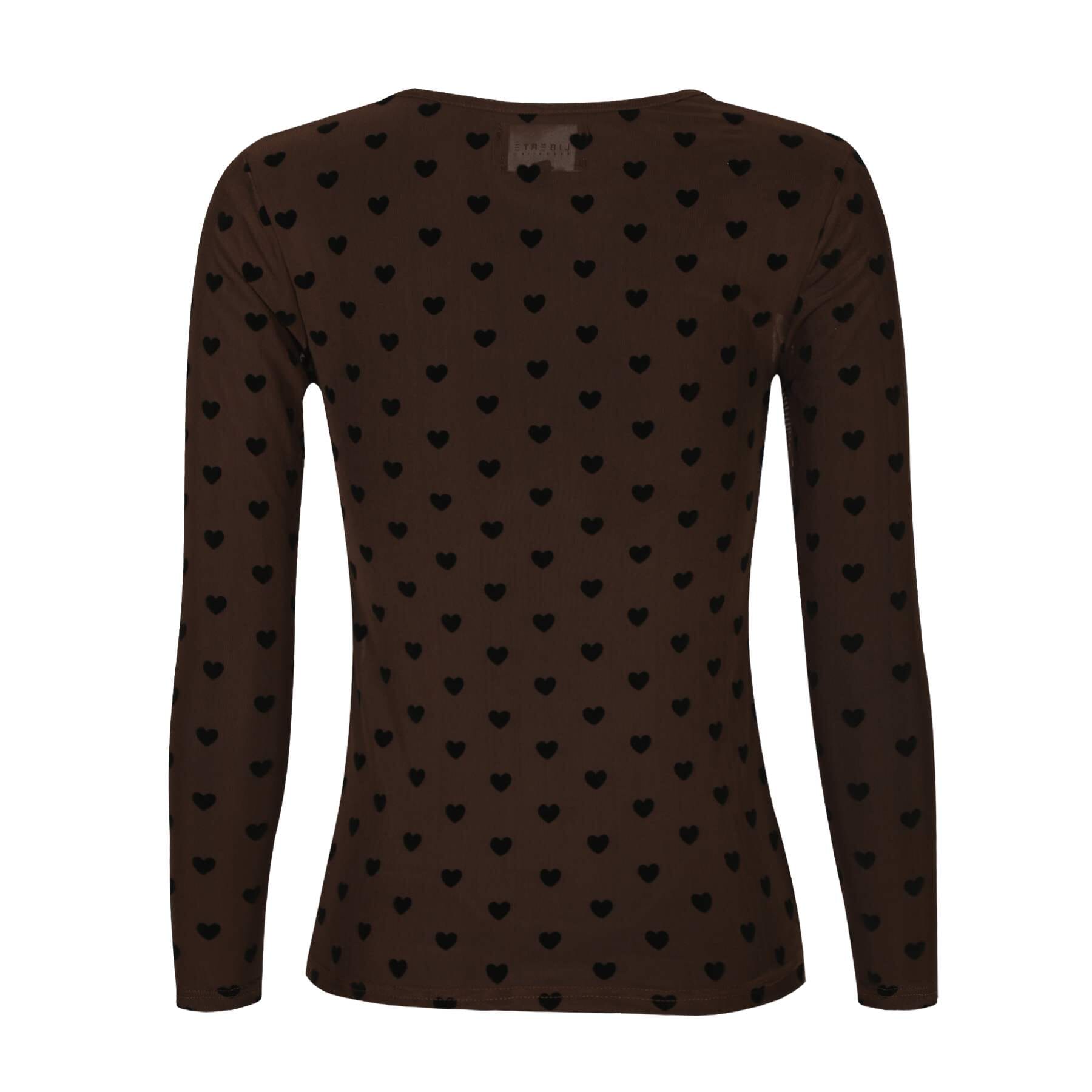 Mesh-T-Shirt von Liberte in Dunkelbraun mit großen schwarzen Punkten. Das T-Shirt hat lange Ärmel und einen runden Halsausschnitt.