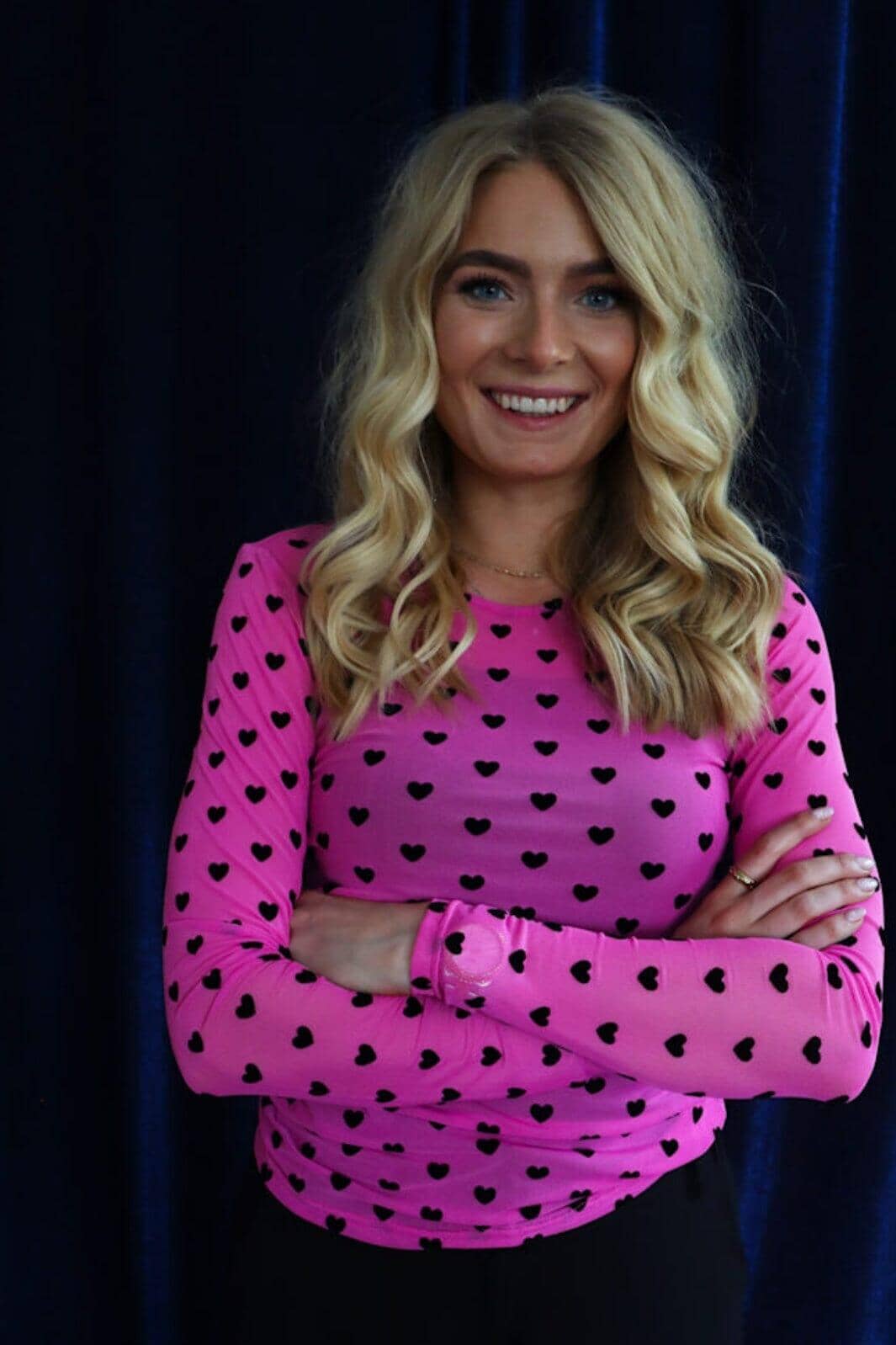 Rosa langärmliges Mesh-T-Shirt von Liberte mit schwarzen Herzen auf der gesamten Oberfläche. Das T-Shirt hat eine Slim-Fit-Passform und einen Rundhalsausschnitt.