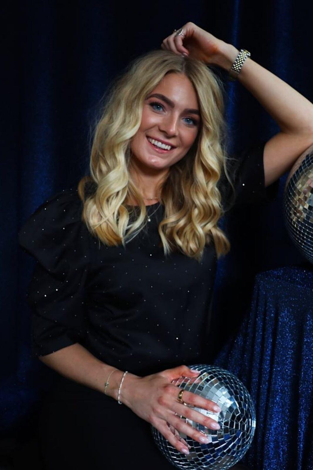 Schwarze Bluse von Liberte mit glänzenden Pailletten in einem Tupfenmuster. Die Bluse hat 3/4-Ärmel und einen runden Halsausschnitt.