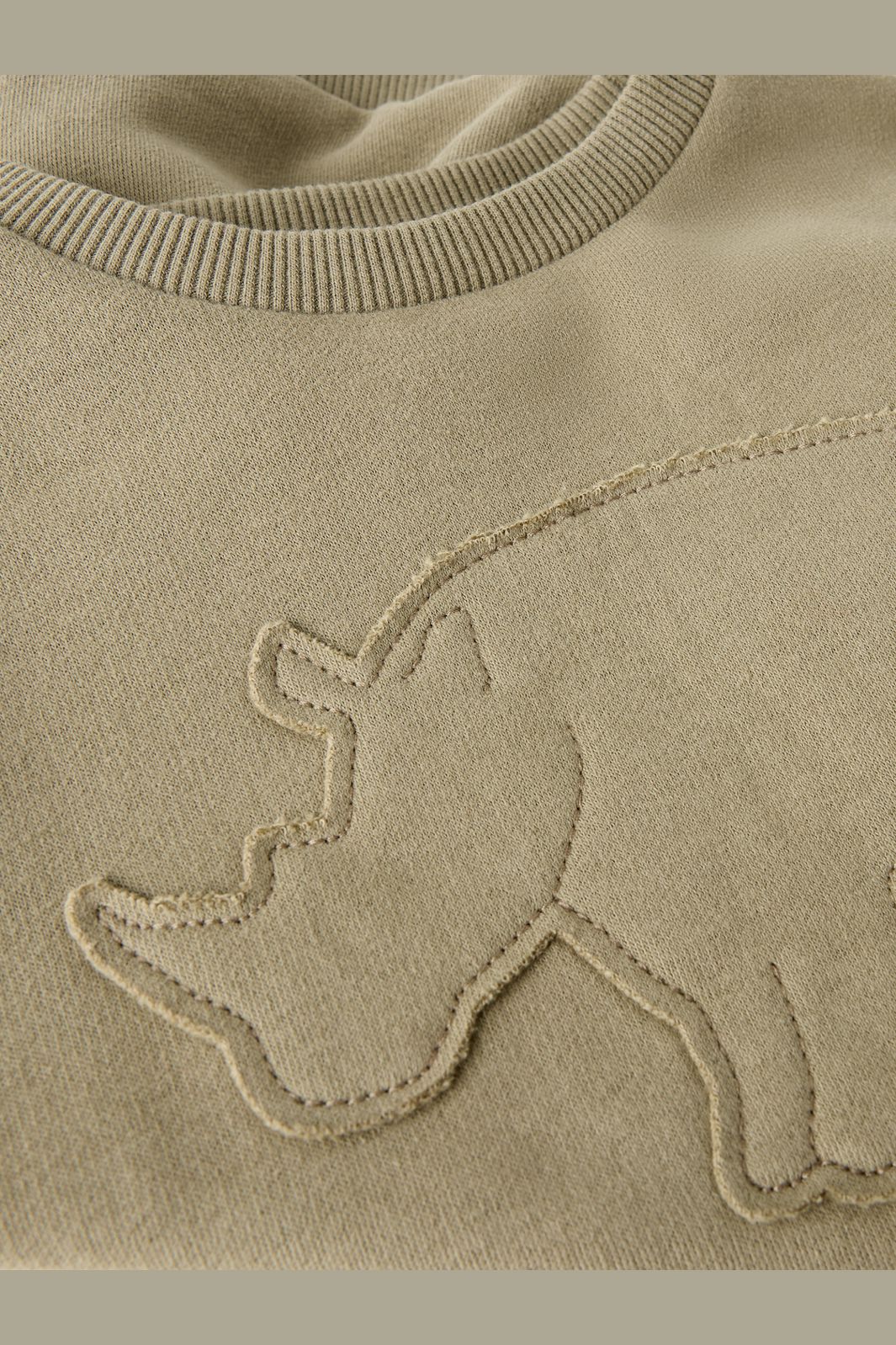 Sweatshirt von Lil' Atelier Mini in Olivgrün mit einem gestickten Nashornmotiv auf der Vorderseite. Das Sweatshirt hat gerippte Bündchen und einen runden Halsausschnitt mit Rippstrick.