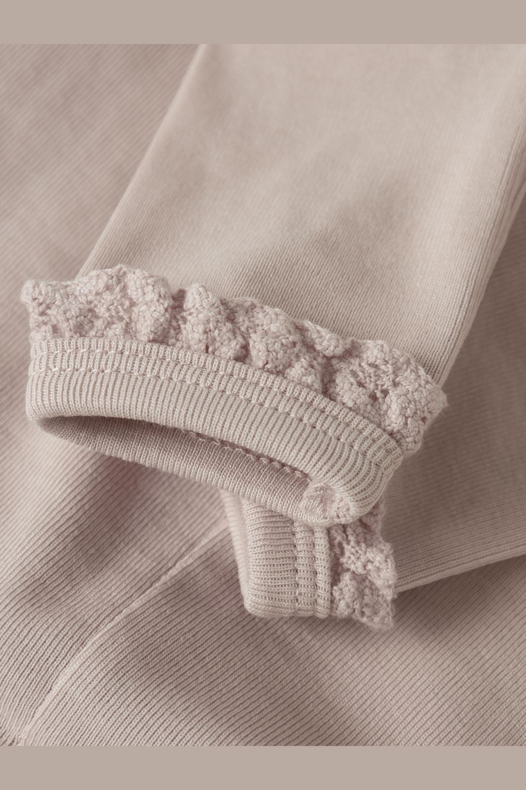 Rosa Leggings von Lil' Atelier mit dekorativen Spitzendetails an den Knöcheln. Die Leggings haben eine Slim-Fit-Passform und einen elastischen Bund.