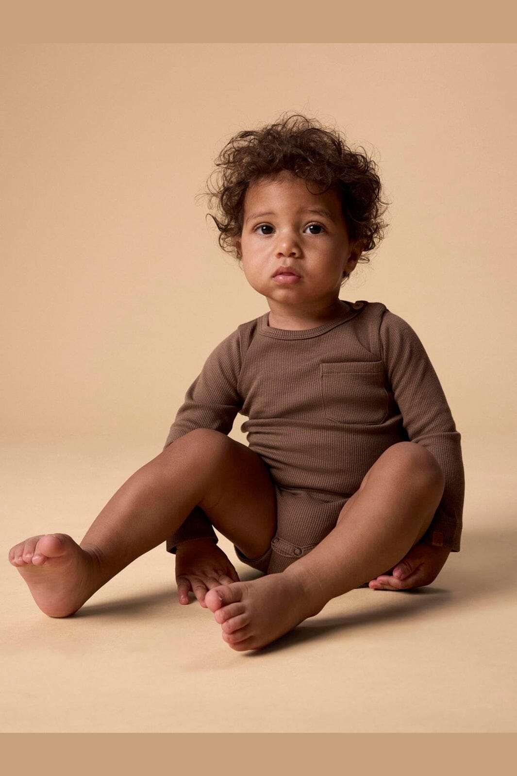 Ein brauner Body von Lil' Atelier aus einer Mischung aus Bio-Baumwolle und Lyocell. Der Body hat eine Slim-Fit-Passform und lange Ärmel.