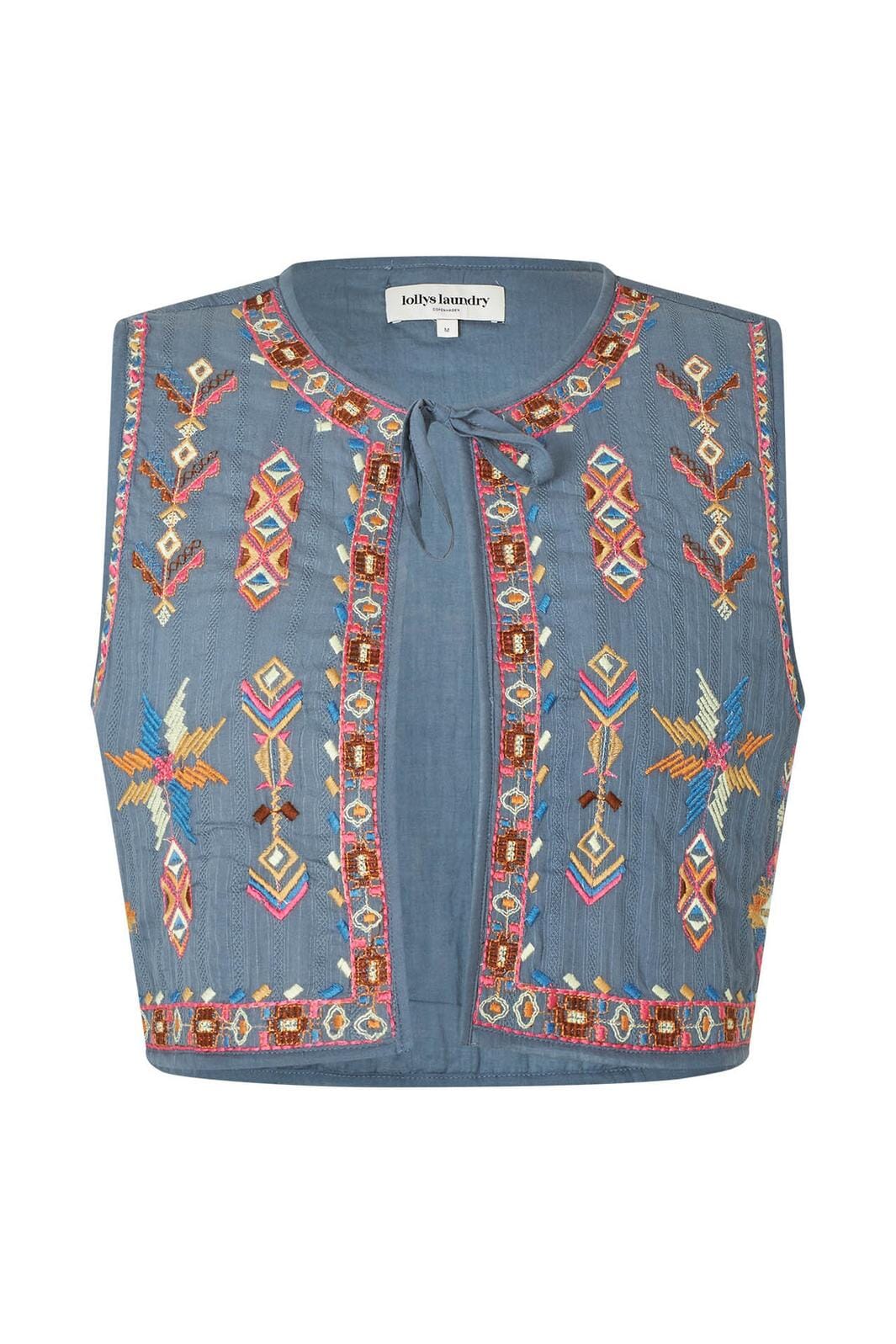 Staubig blaue Weste von Lollys Laundry mit bunten Stickereien. Die Weste hat einen runden Ausschnitt mit Bindeband und ist aus Baumwolle mit detaillierten Mustern entlang der Kanten gefertigt.
