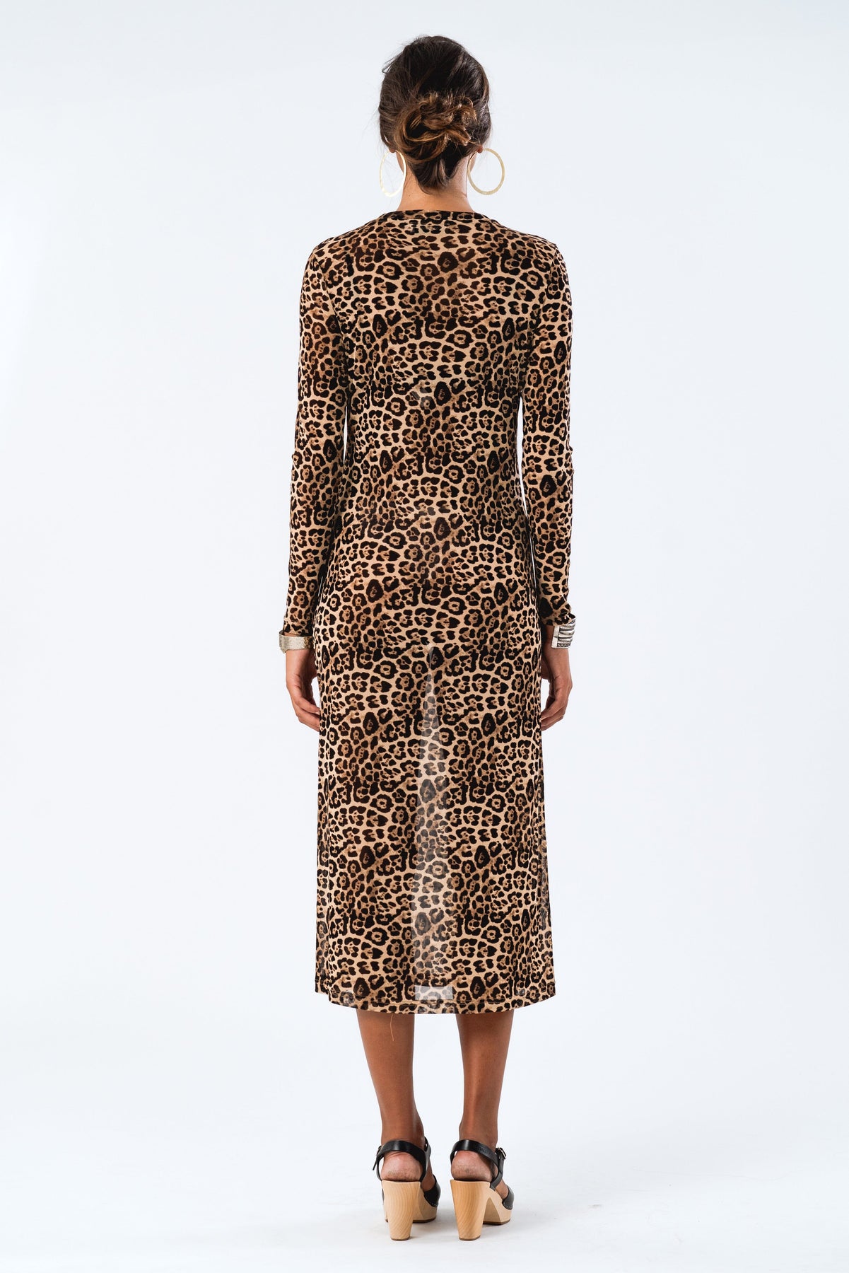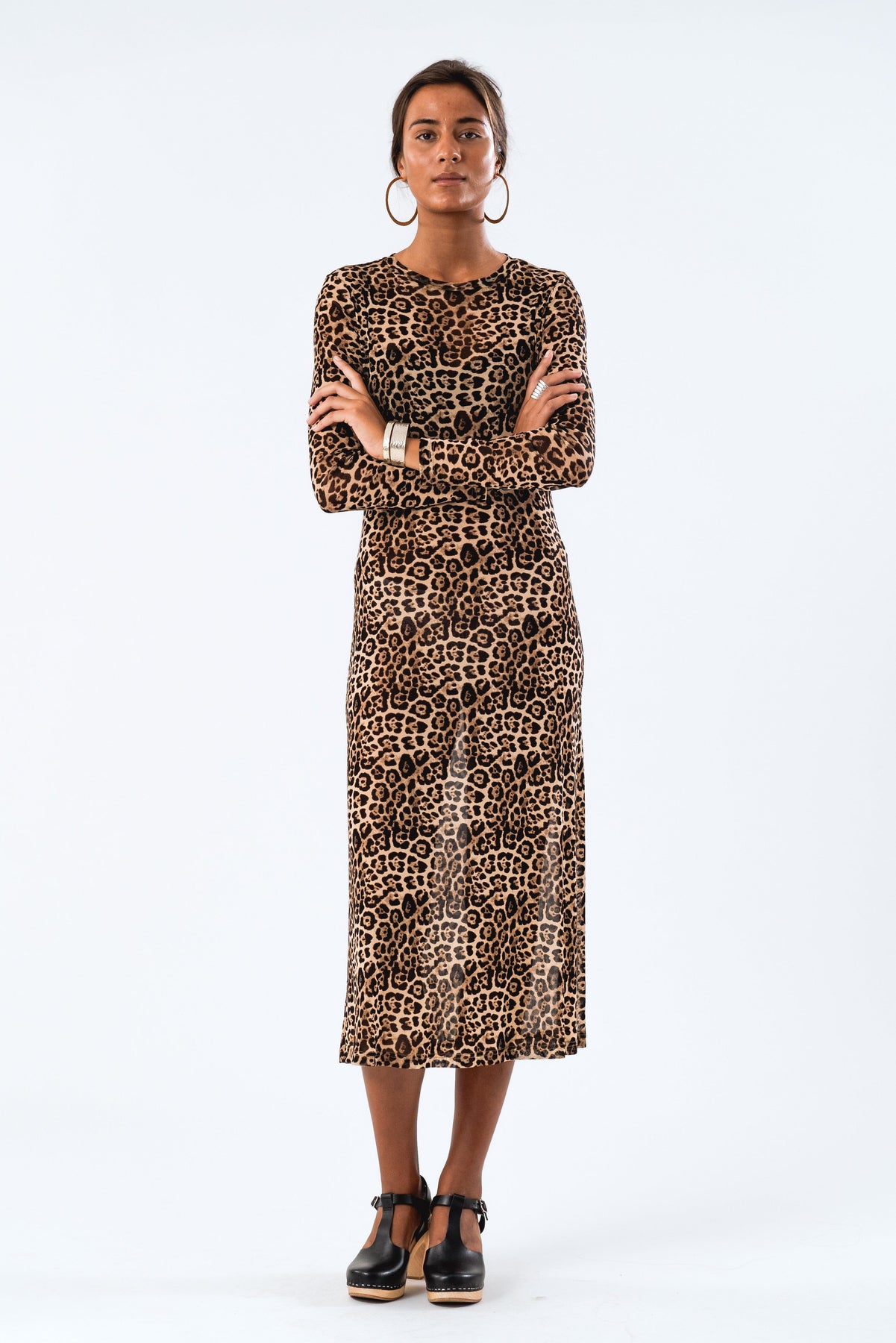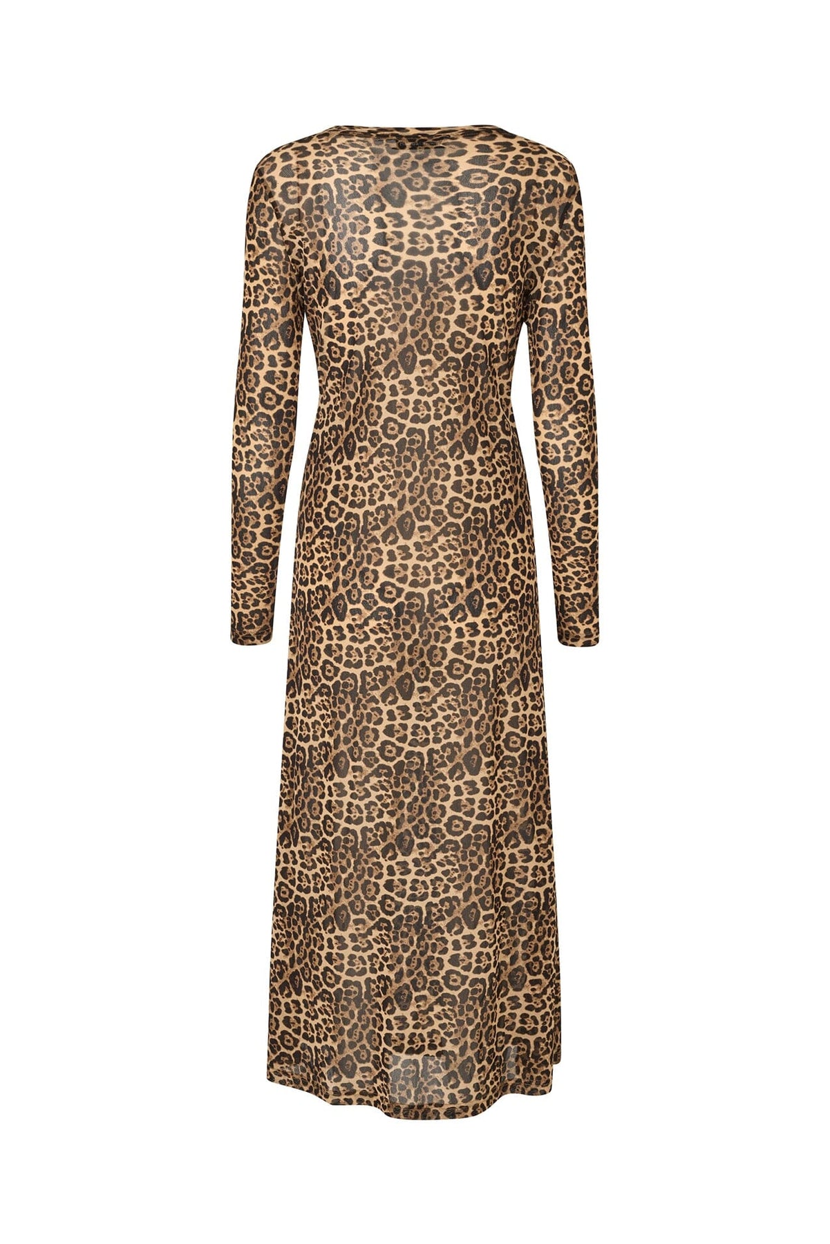 Langärmliges Maxikleid von Lollys Laundry mit Leopardenmuster in braunen und schwarzen Nuancen auf beigem Hintergrund. Das Kleid hat einen runden Ausschnitt und reicht bis zu den Knöcheln.