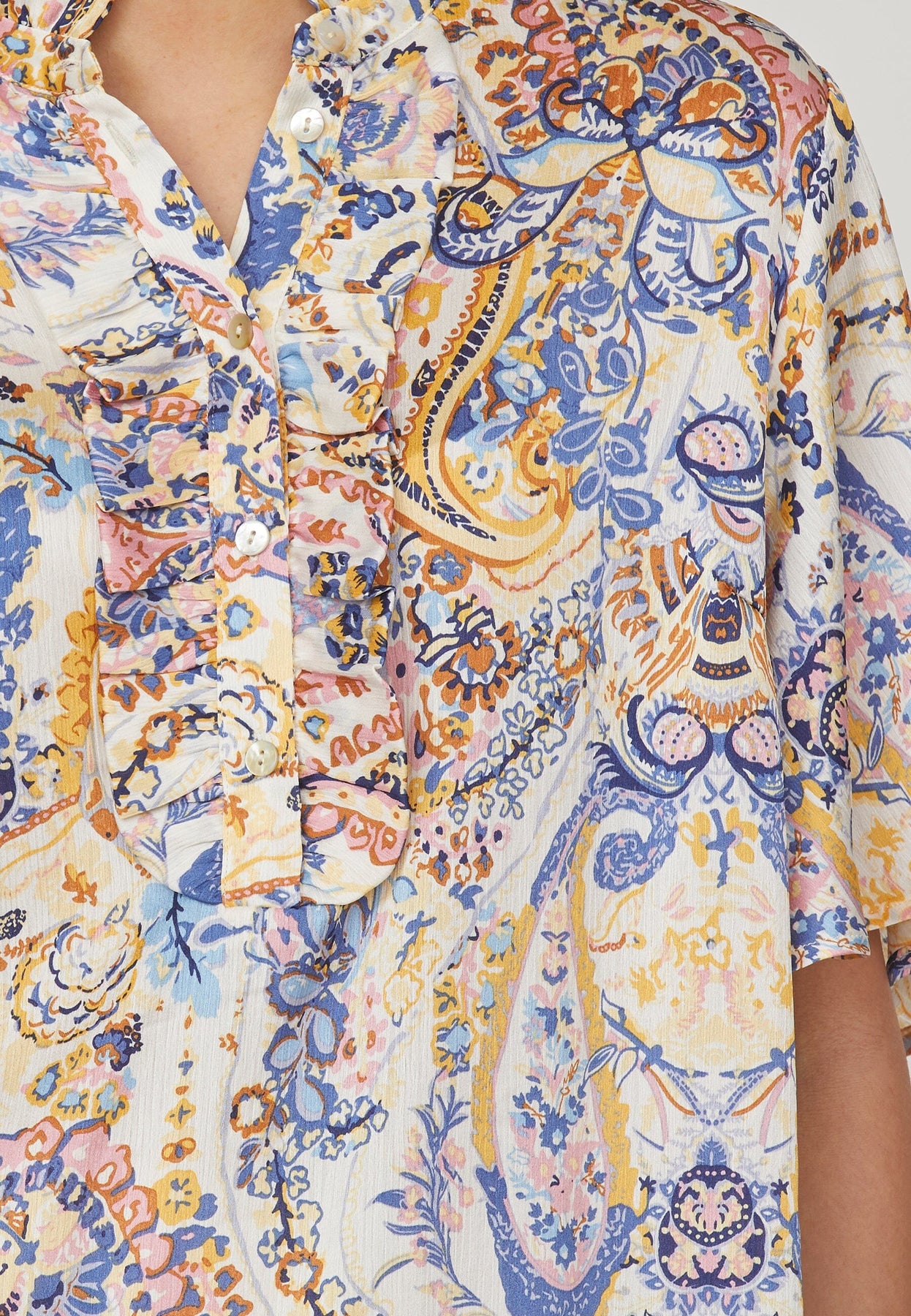 ist ein kurzes, locker sitzendes Top mit einem feinen Paisley-Muster. Das Top hat ellbogenlange Ärmel, einen Schößchen-Saum und eine kurze Knopfleiste mit femininen Rüschen. Das Model ist 174 cm groß und trägt eine Größe S.