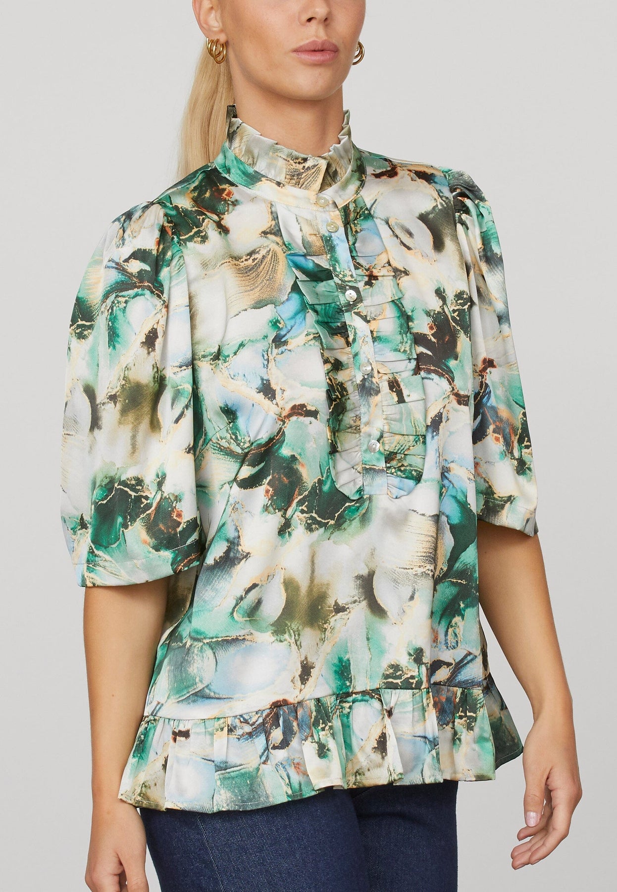 Kurzes Oberteil von Love & Divine mit einem marmorierten Muster in grünen und weißen Nuancen. Das Oberteil hat einen hohen Kragen mit Rüschen, 3/4-Ärmel und Knöpfe vorne.
