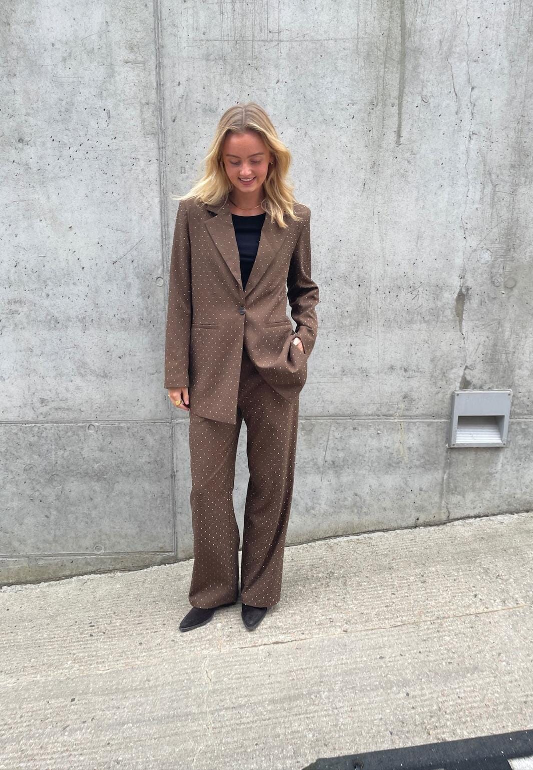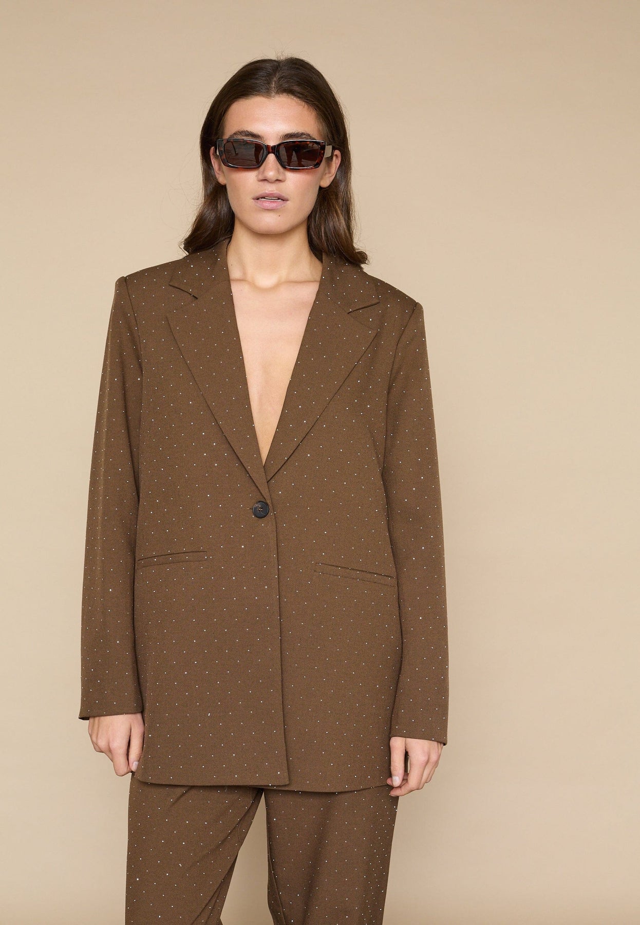 Blazer von Love & Divine in Braun mit kleinen Rhinestone-Details. Die Jacke hat einen klassischen Schnitt mit Revers und einem einzelnen Knopfverschluss.
