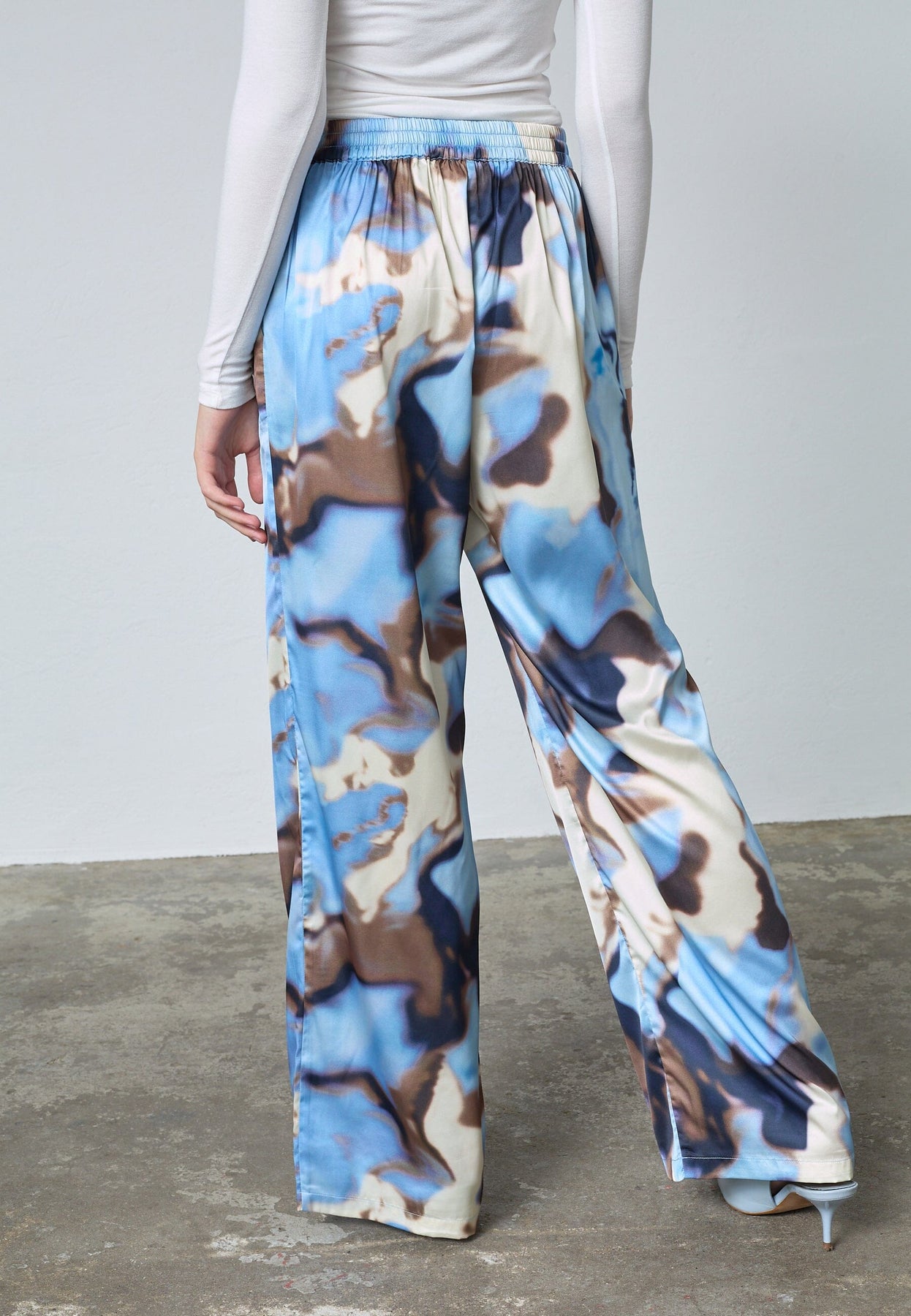 Hose von Love & Divine aus 100% Polyester mit einem blauen Wasserprint-Muster. Die Hose hat ein weit geschnittenes Bein-Design und eine lockere Passform.