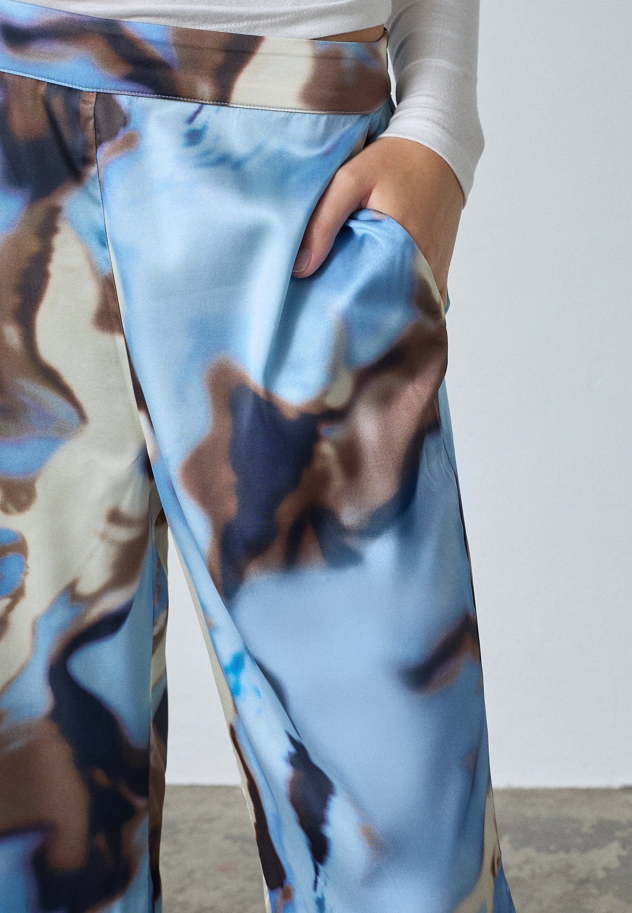 Hose von Love & Divine aus 100% Polyester mit einem blauen Wasserprint-Muster. Die Hose hat ein weit geschnittenes Bein-Design und eine lockere Passform.
