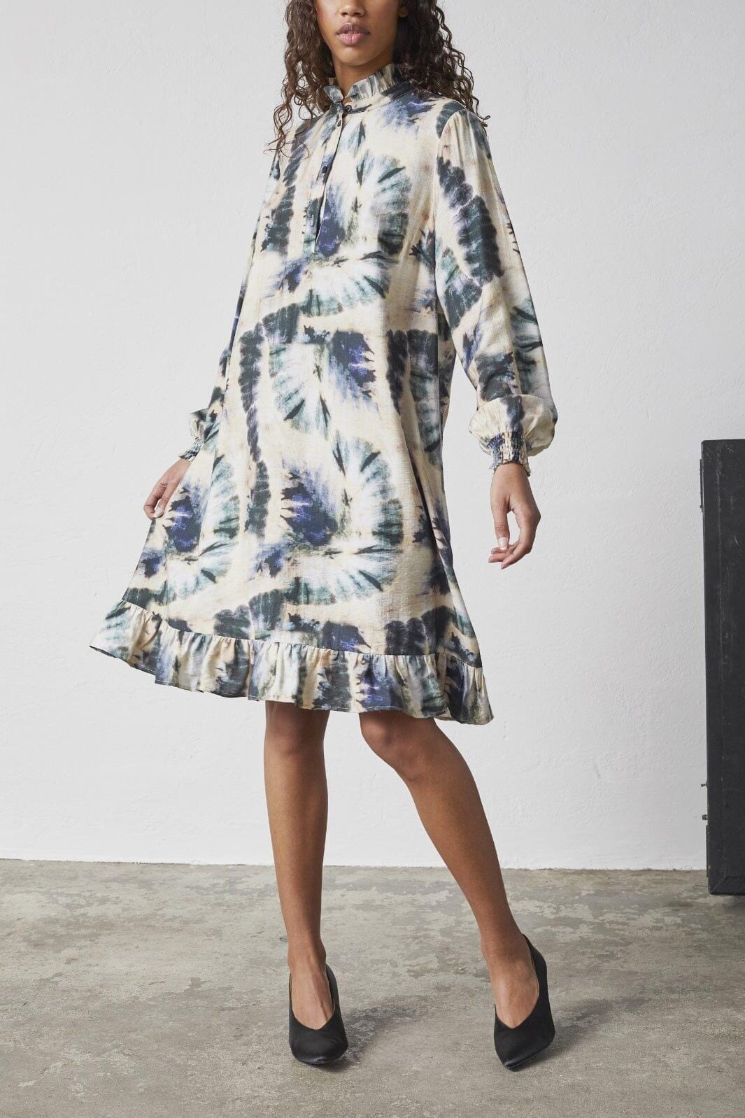 Kleid von Love & Divine mit Tie-Dye-Muster in Beige-, Grün- und Blautönen. Es hat einen hohen Kragen, Knopfdetails vorne und einen gerafften Saum unten. Die langen Ärmel sind an den Handgelenken gerafft.