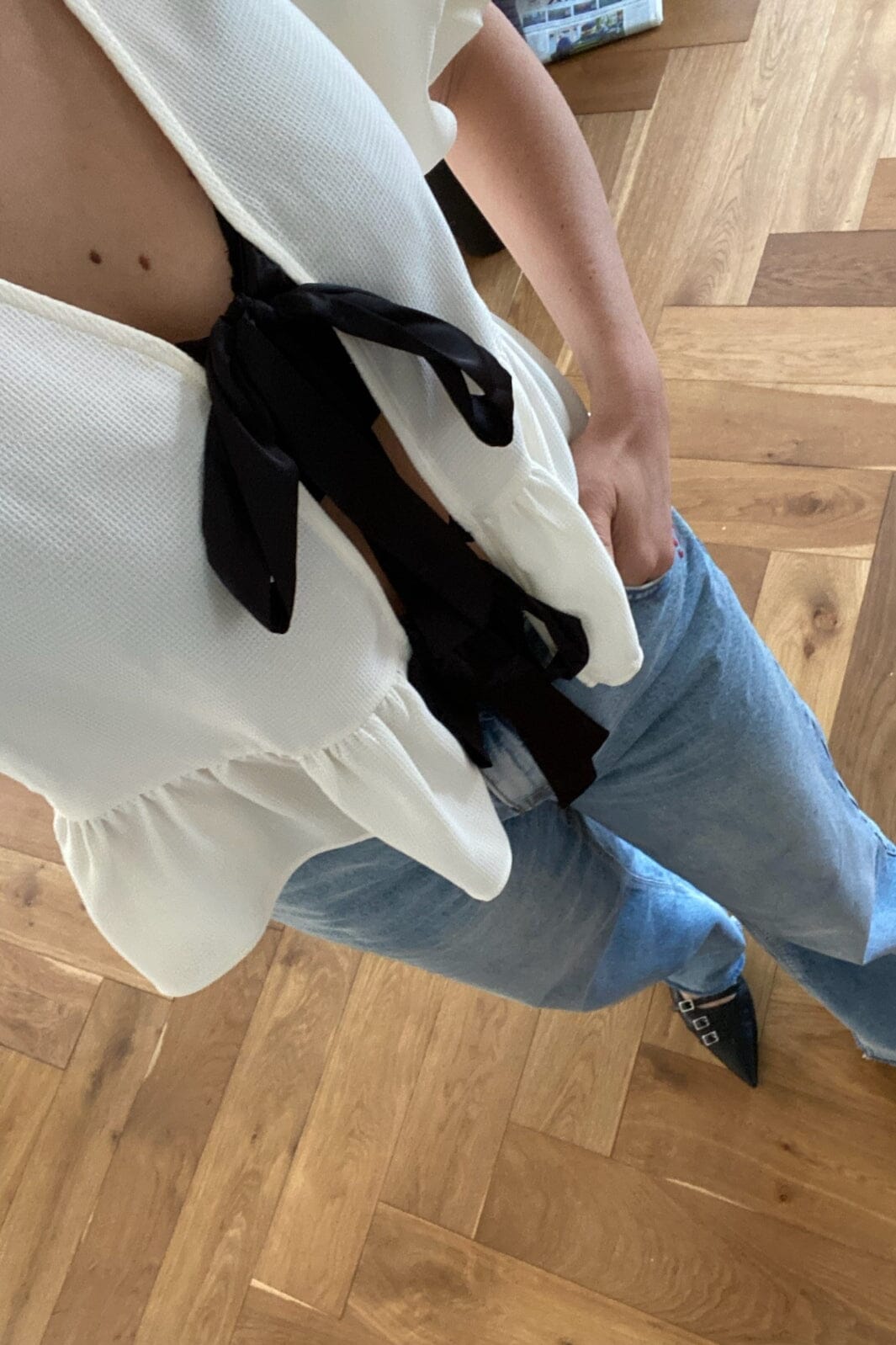 ist eine süße, locker sitzende Bluse mit kurzen Puffärmeln. Sie hat 2 Bindebänder in der Mitte und einen Peplum am Saum. Das Model ist 182 cm groß und trägt eine Größe S.
