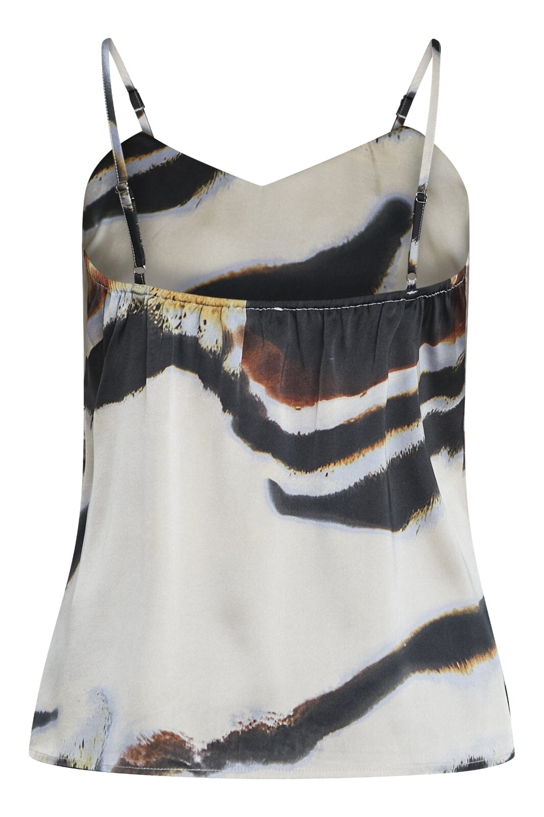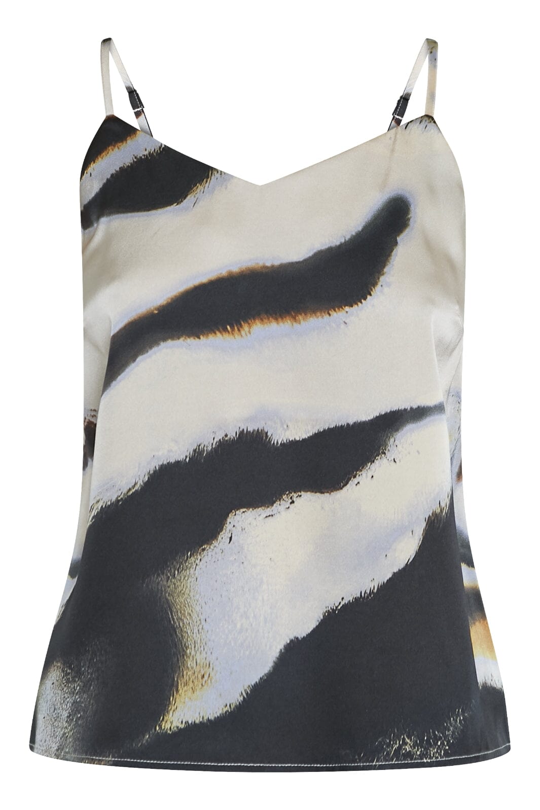 Top von Love & Divine mit welligem Muster in Schwarz, Beige und Gold. Sie hat dünne, verstellbare Träger und einen V-Ausschnitt vorne. Die lockere Passform bietet Bewegungsfreiheit.